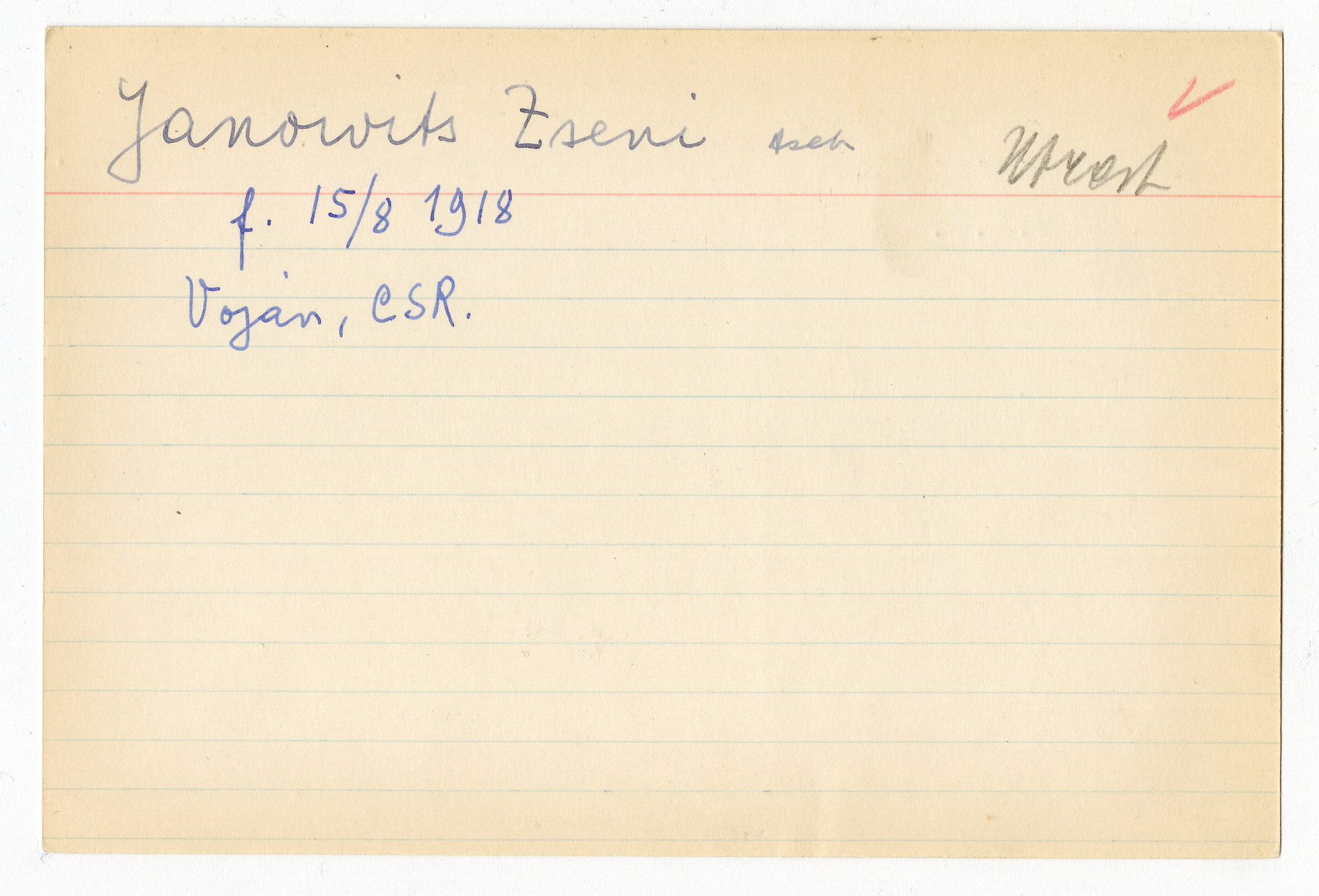 Ett skrivkort med patientuppgifter gällande Zseni Janowitz. På baksidan uppgifter om matpaket till Irma Saxl i Theresienstadt.