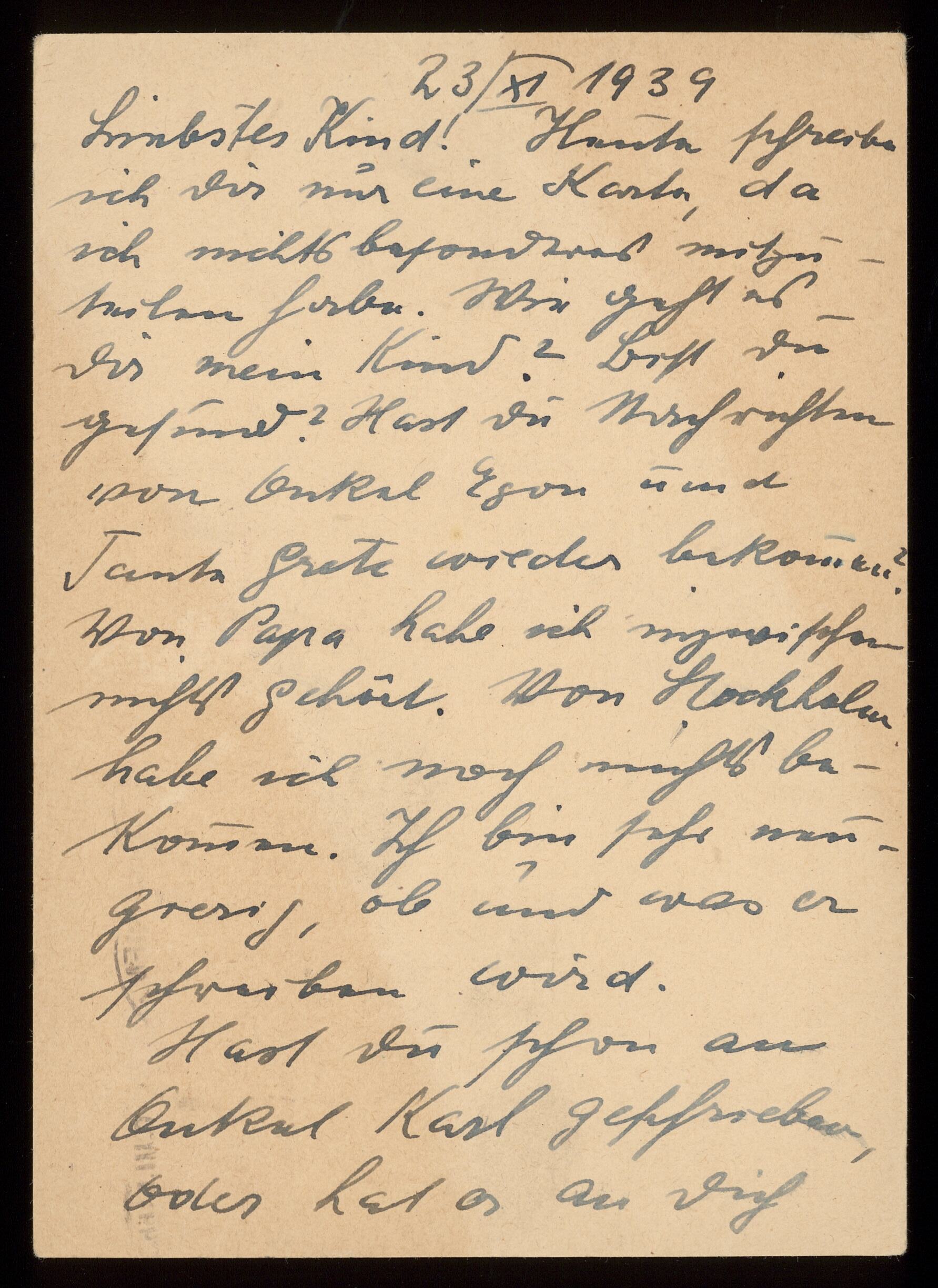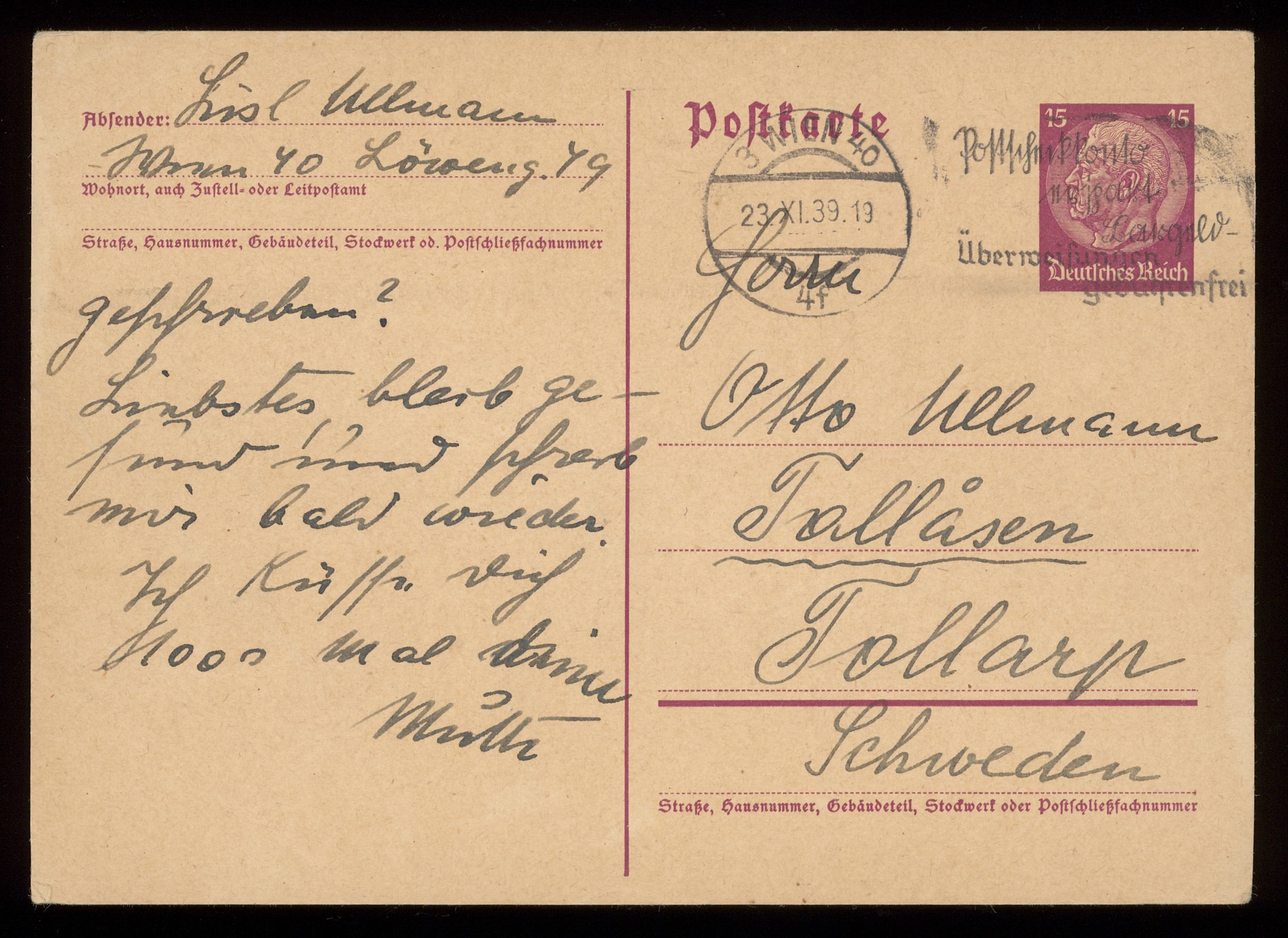 Brev till Otto Ullman från föräldrarna Josef och Elise Ullmann daterat 23 november 1939 Wien.