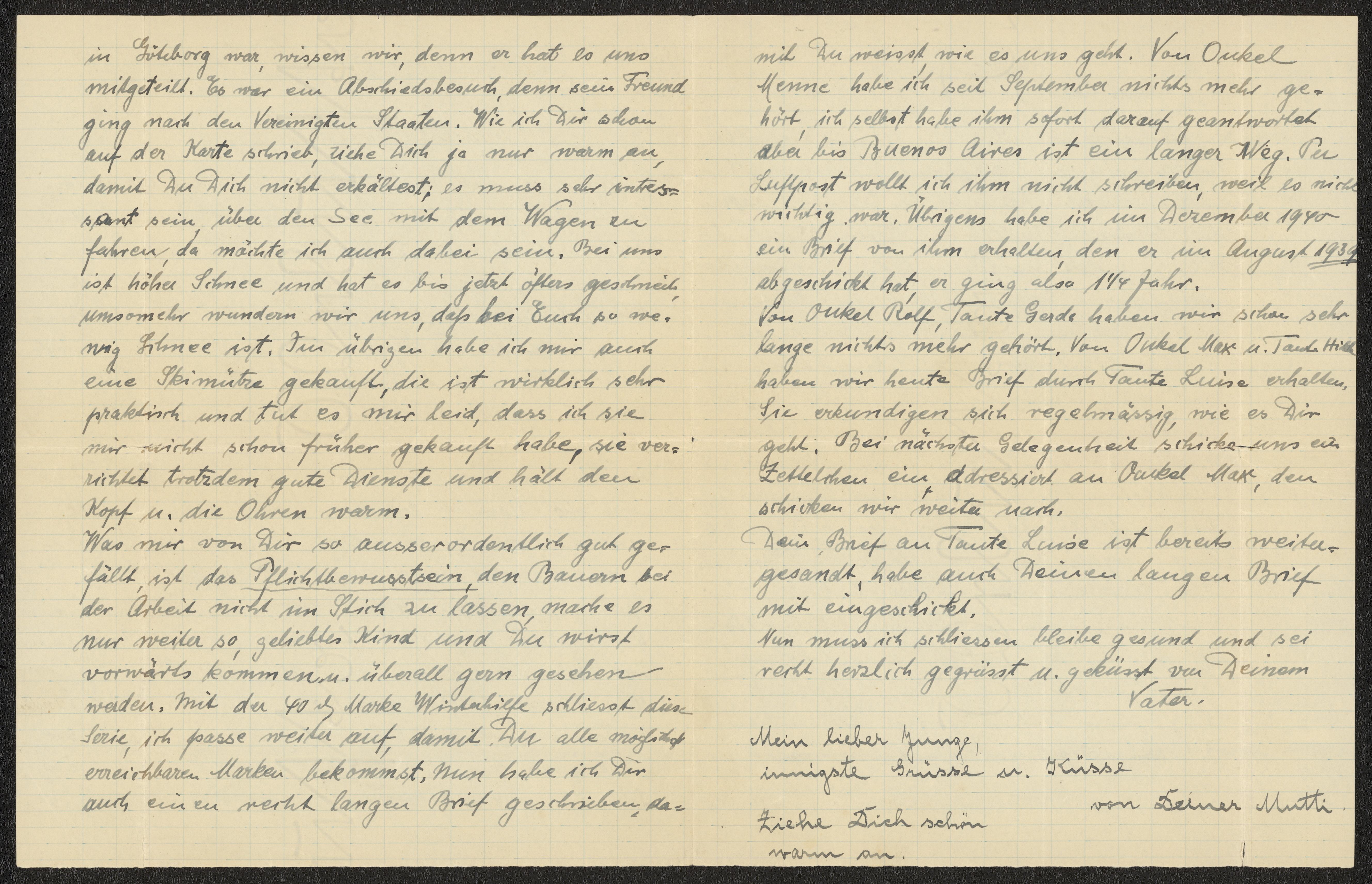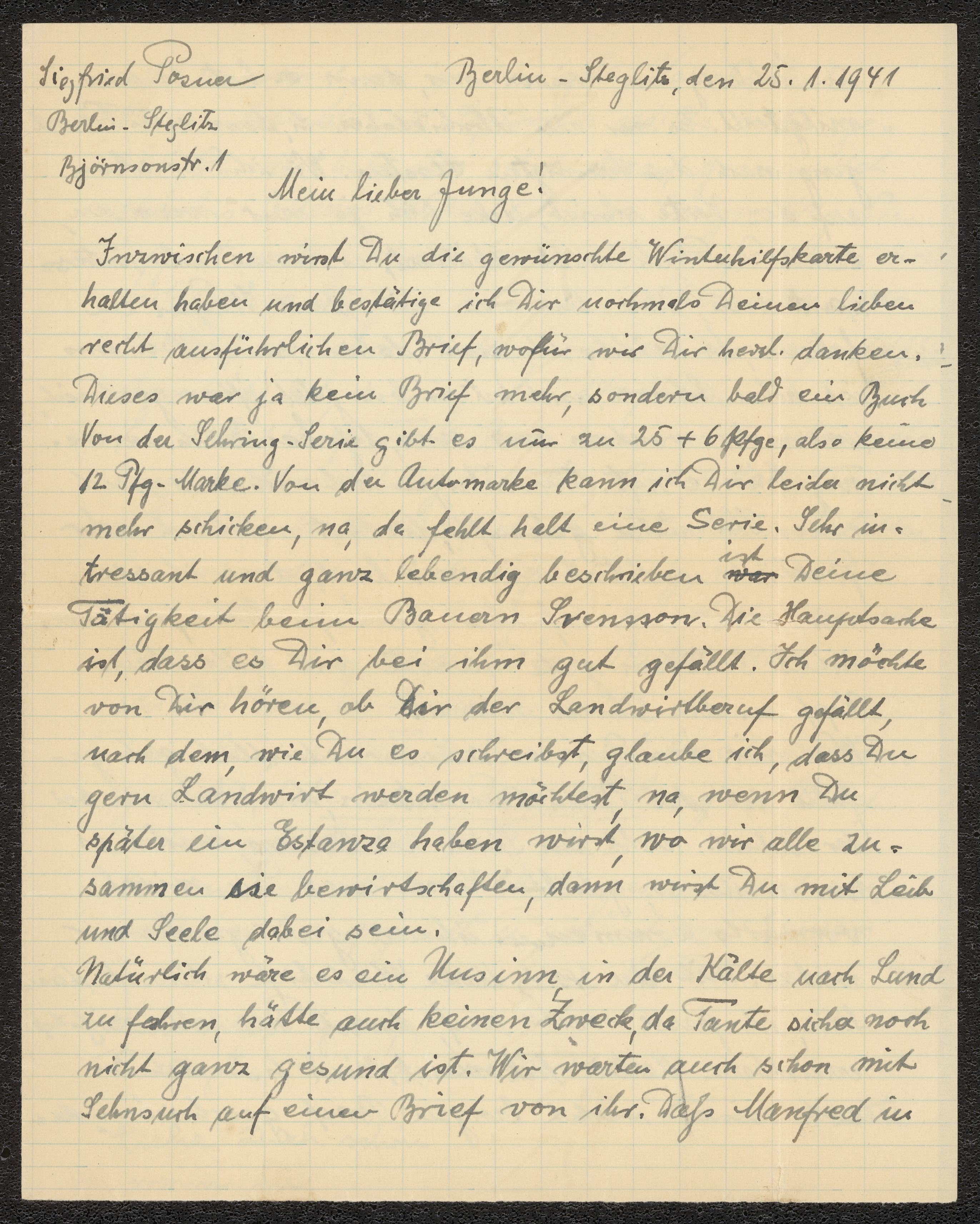 Brev från föräldrarna Anna och Siegfried Posner och "tante" gammelfaster Hedwig till Ludwig Posner daterat 25 januari 1941.