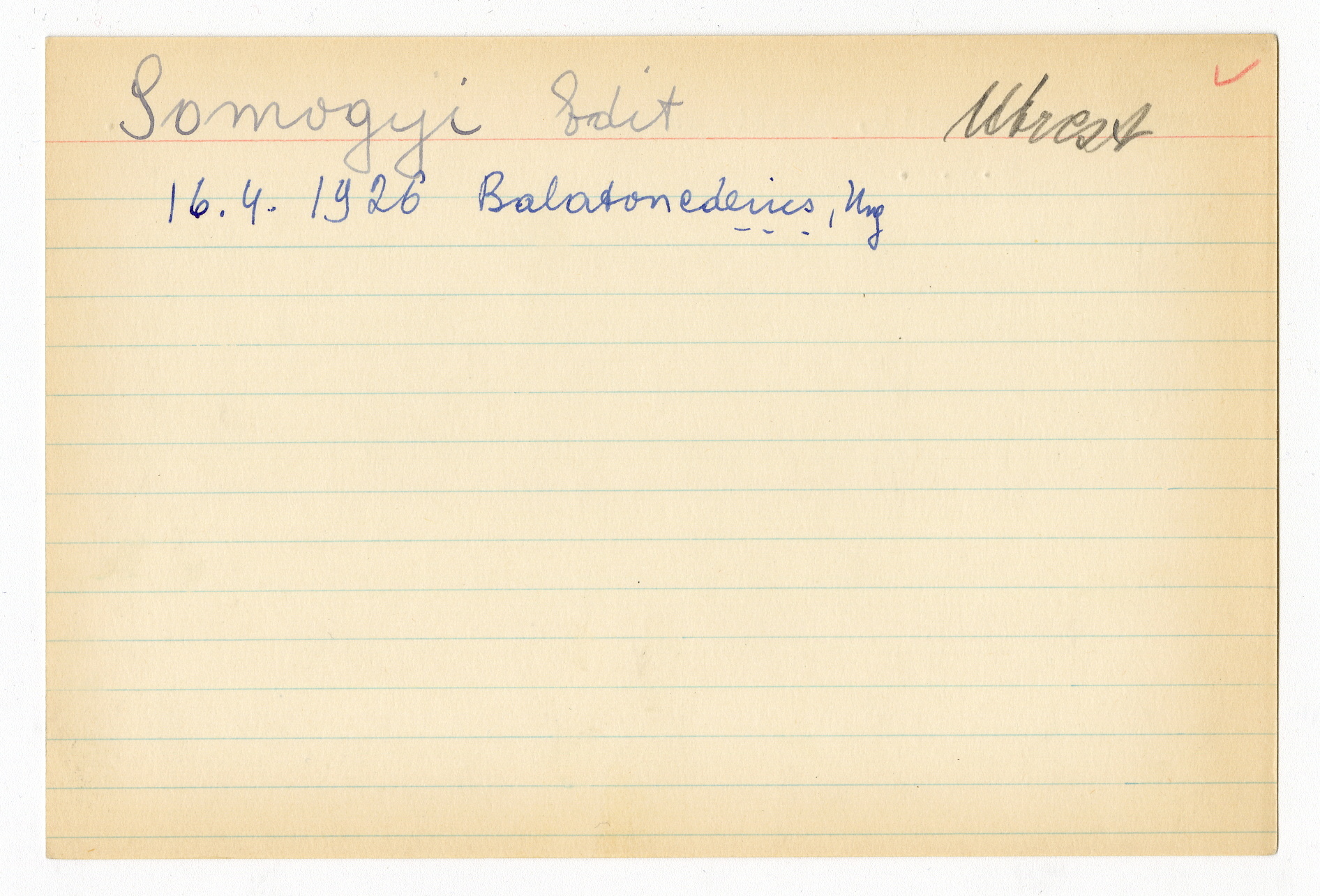 Ett skrivkort med patientuppgifter gällande Edit Somogyi. På baksidan uppgifter om matpaket till Edit Stargardt i Theresienstadt.