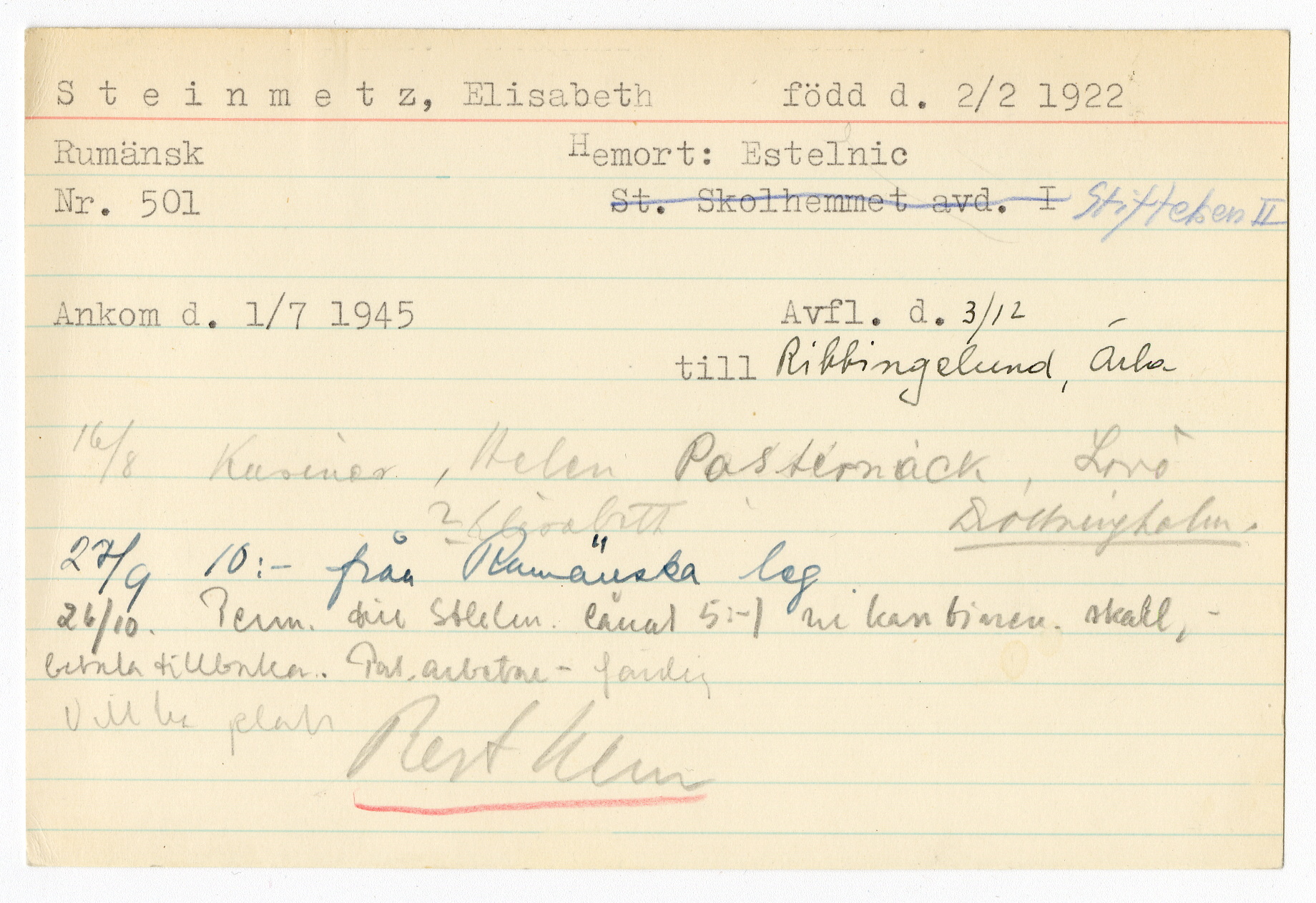 Ett skrivkort med patientuppgifter gällande Elisabeth Steinmetz.