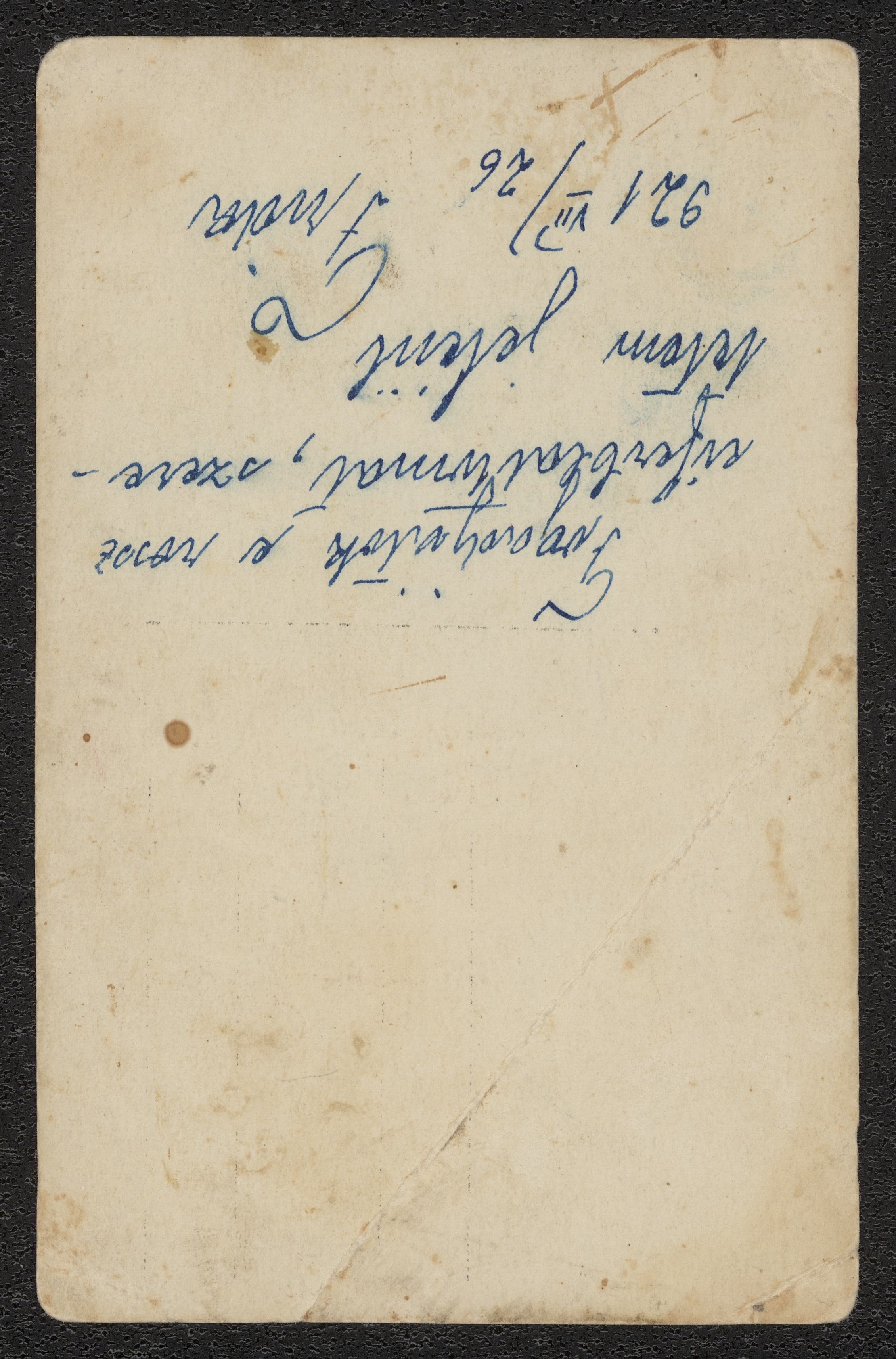 Porträtt av Frida Szmuk, hållandes en blomsterbukett. På baksidan text på ungerska samt notering "1921 VII 26 Frida".