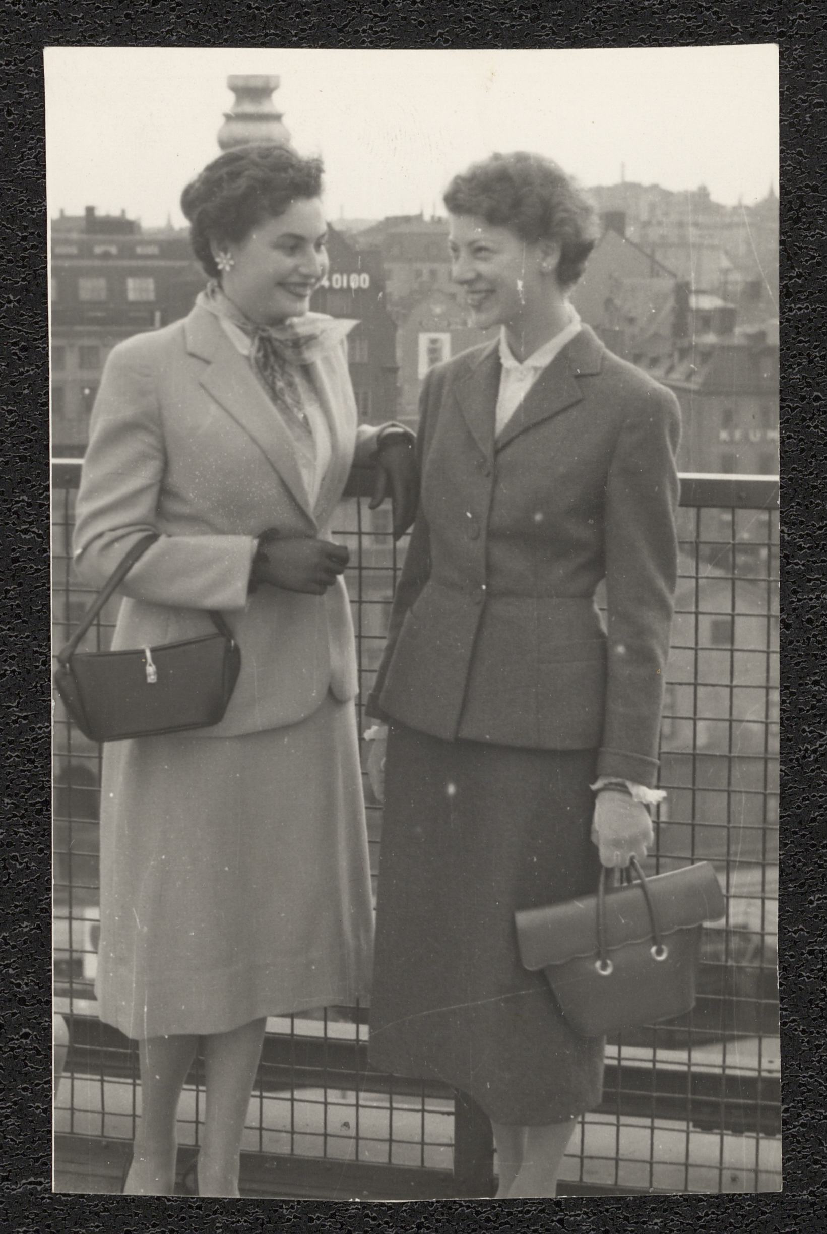 Två leende kvinnor står på någn form av balkong med stockholmsvy i bakgrunden.På baksidan finns texten "Marie Mirjam efter Uddevalla".