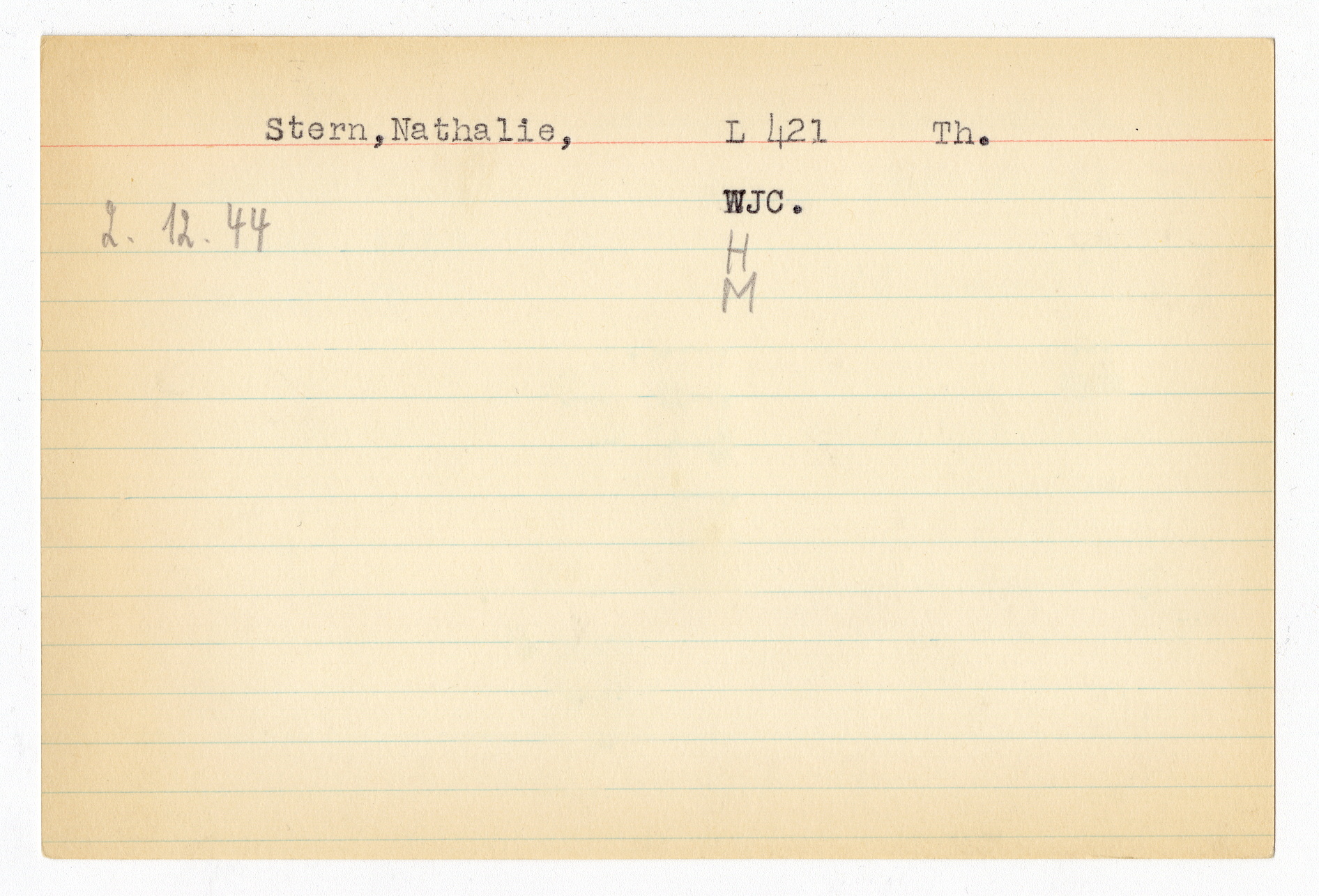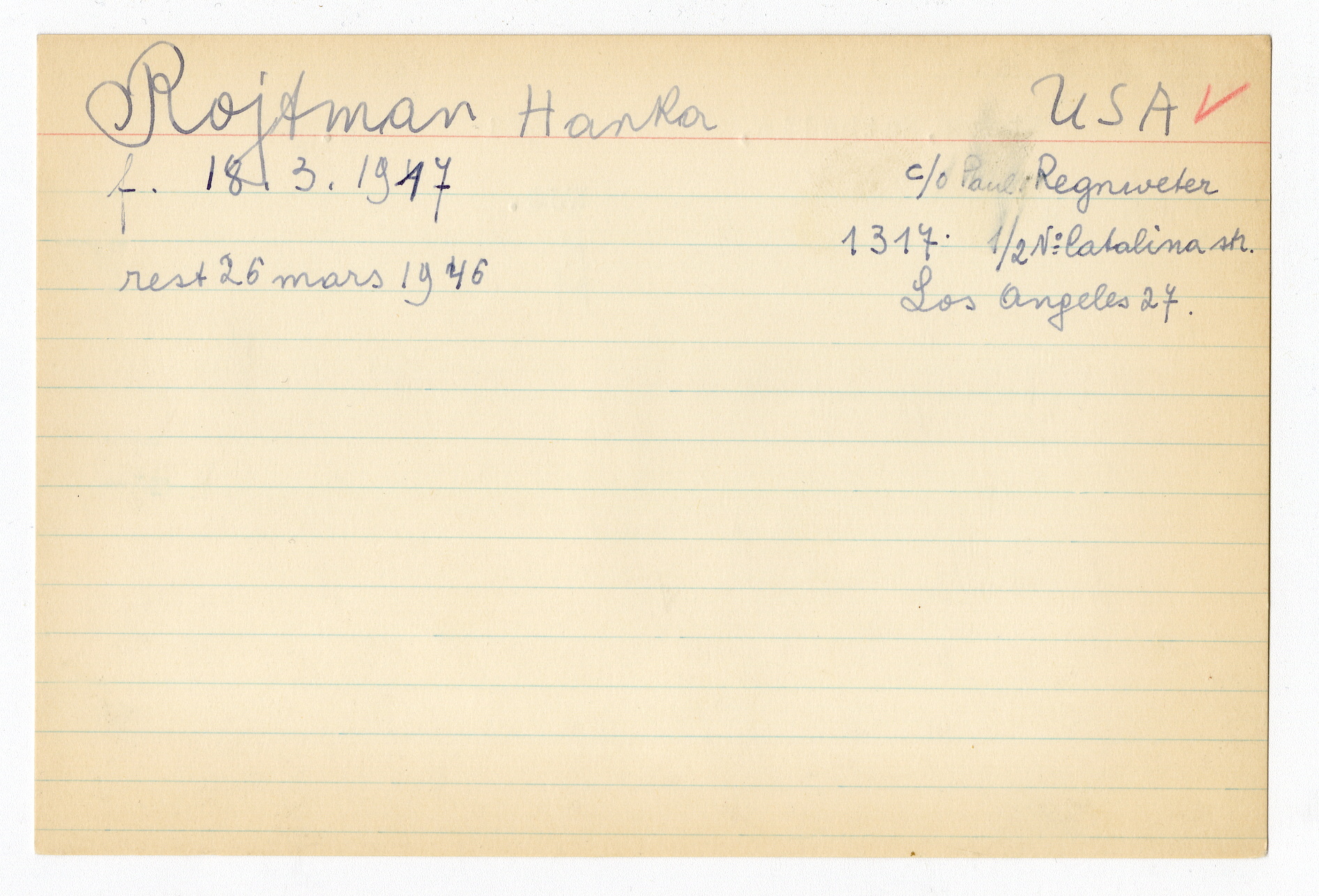 Ett skrivkort med patientuppgifter gällande Hanka Rojtman. På baksidan uppgifter om matpaket till f. Stern i Theresienstadt.