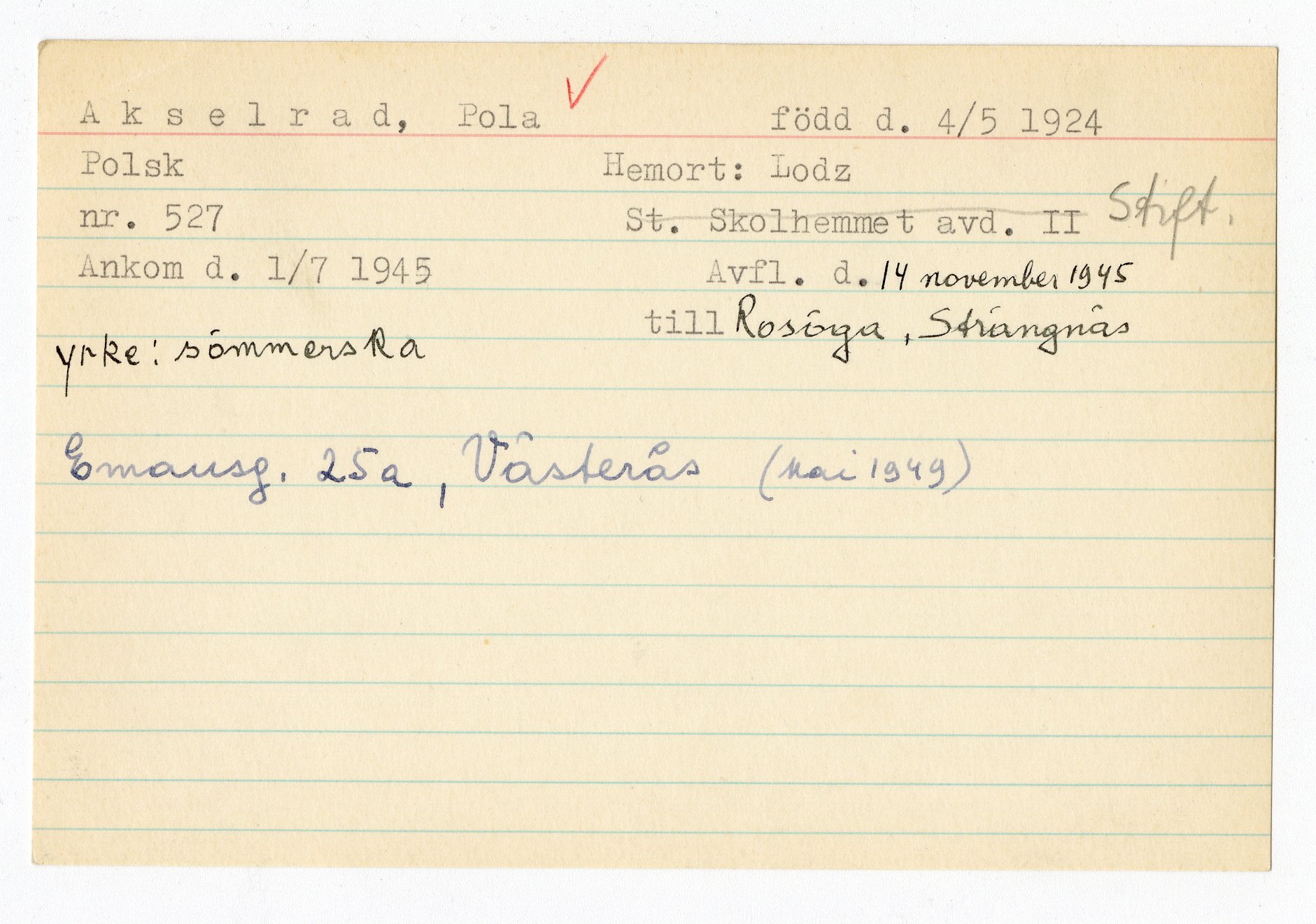 Ett skrivkort med patientuppgifter gällande Pola Akselrad.