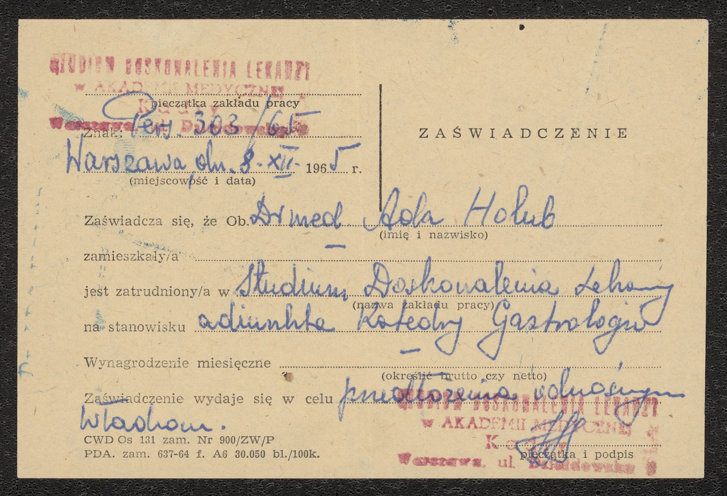 Arbetsintyg för Ada Holub Studium Doskonalenia Lekarzi utfärdat 8 december 1965.