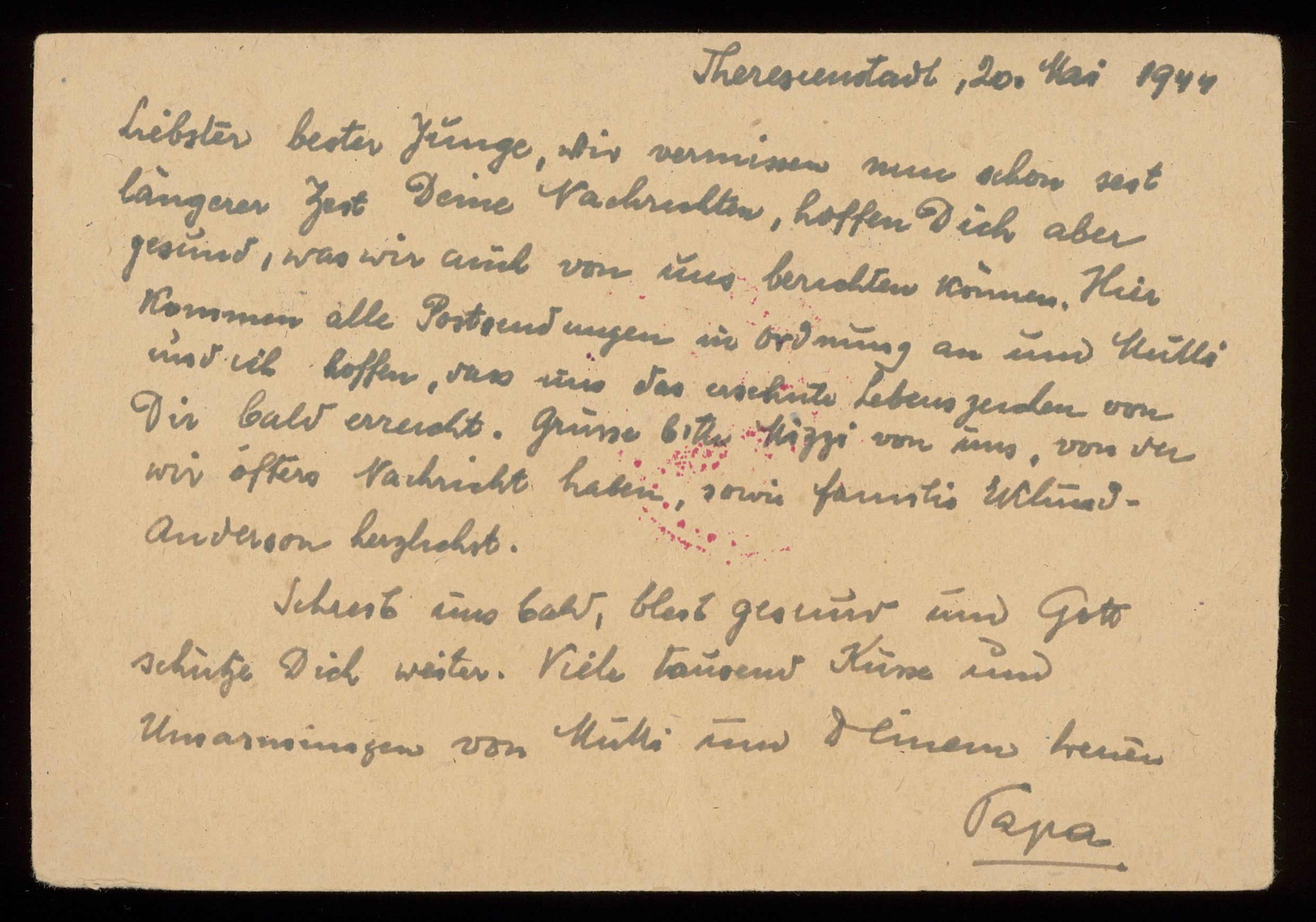 Brev till Otto Ullman från föräldrarna Josef och Elise Ullmann daterat 20 maj 1944 Theresienstadt.