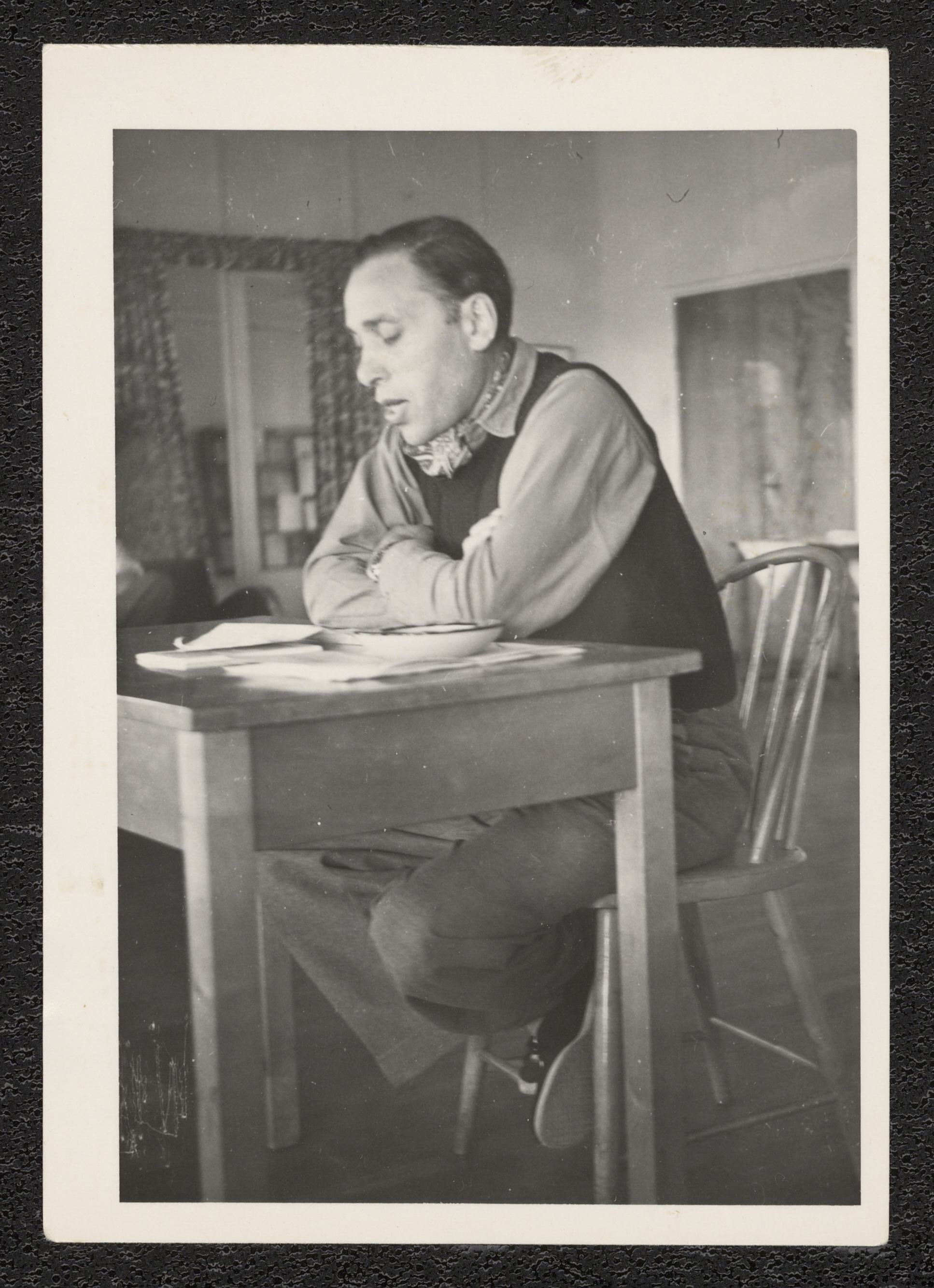 En ung man sitter vid ett bord med en tallrik och någon form av dokument framför sig. Hans mun är öppen som om han sjunger eller talar. Bilden har tillhört Georg Witt och är troligen tagen vid en återträff i Uddevalla 1954.