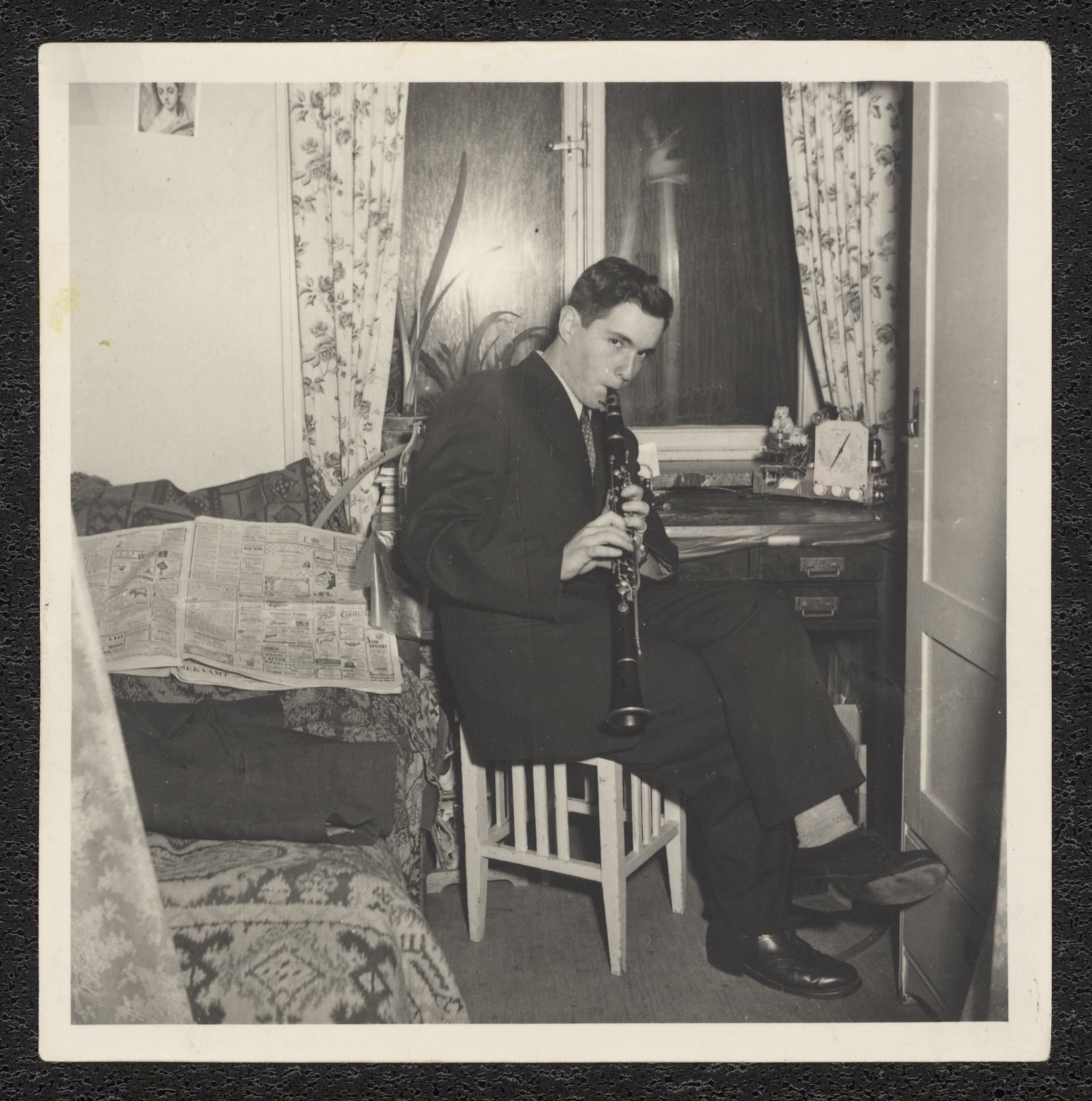 Georg Witt sitter i ett sovrum på en stol med en klarinett i munnen. På sängen bredvid honom ligger en tidning uppslagen. PÅ baksidan finns årtalet 1952.