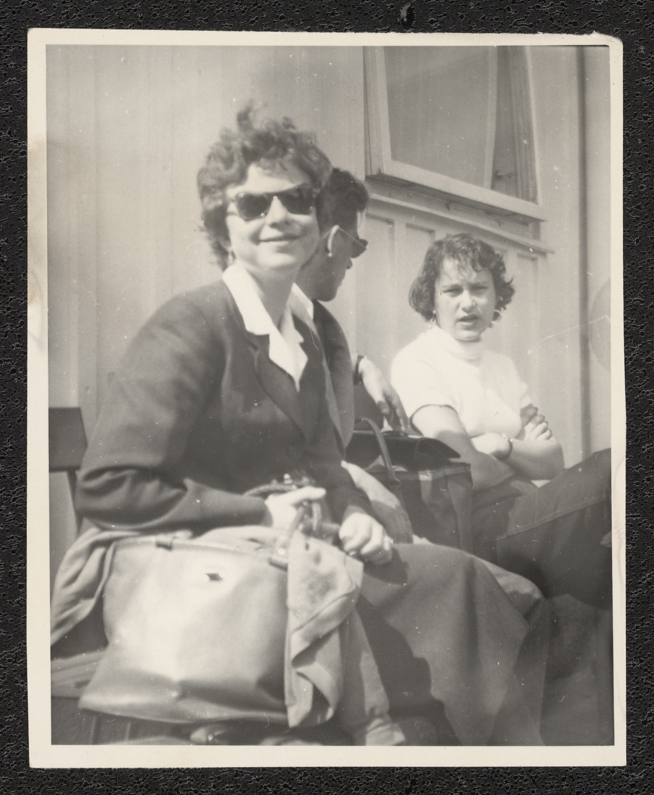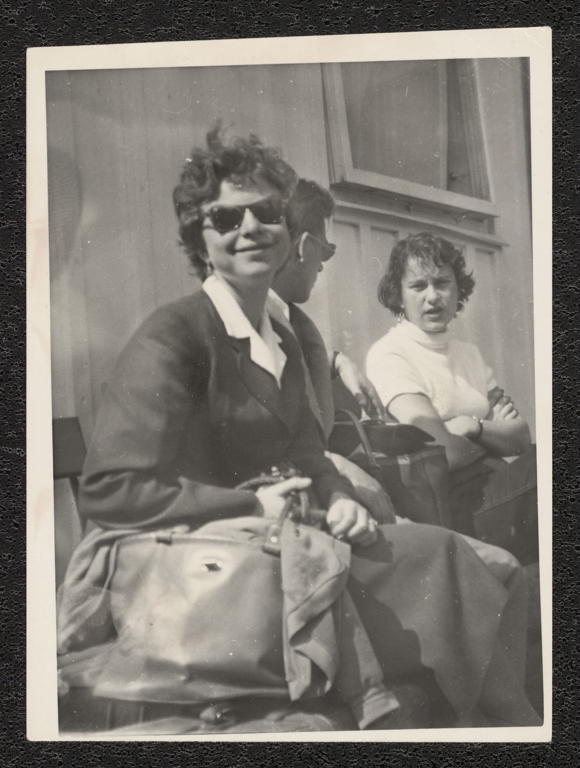 Tre personer sitter i solen vid en husvägg. De har väskor med sig. Kvinnan närmast iförd solglasögon ler mot fotografen. Bilden har tillhört Georg Witt och är troligen tagen vid en återträff i Uddevalla 1954.