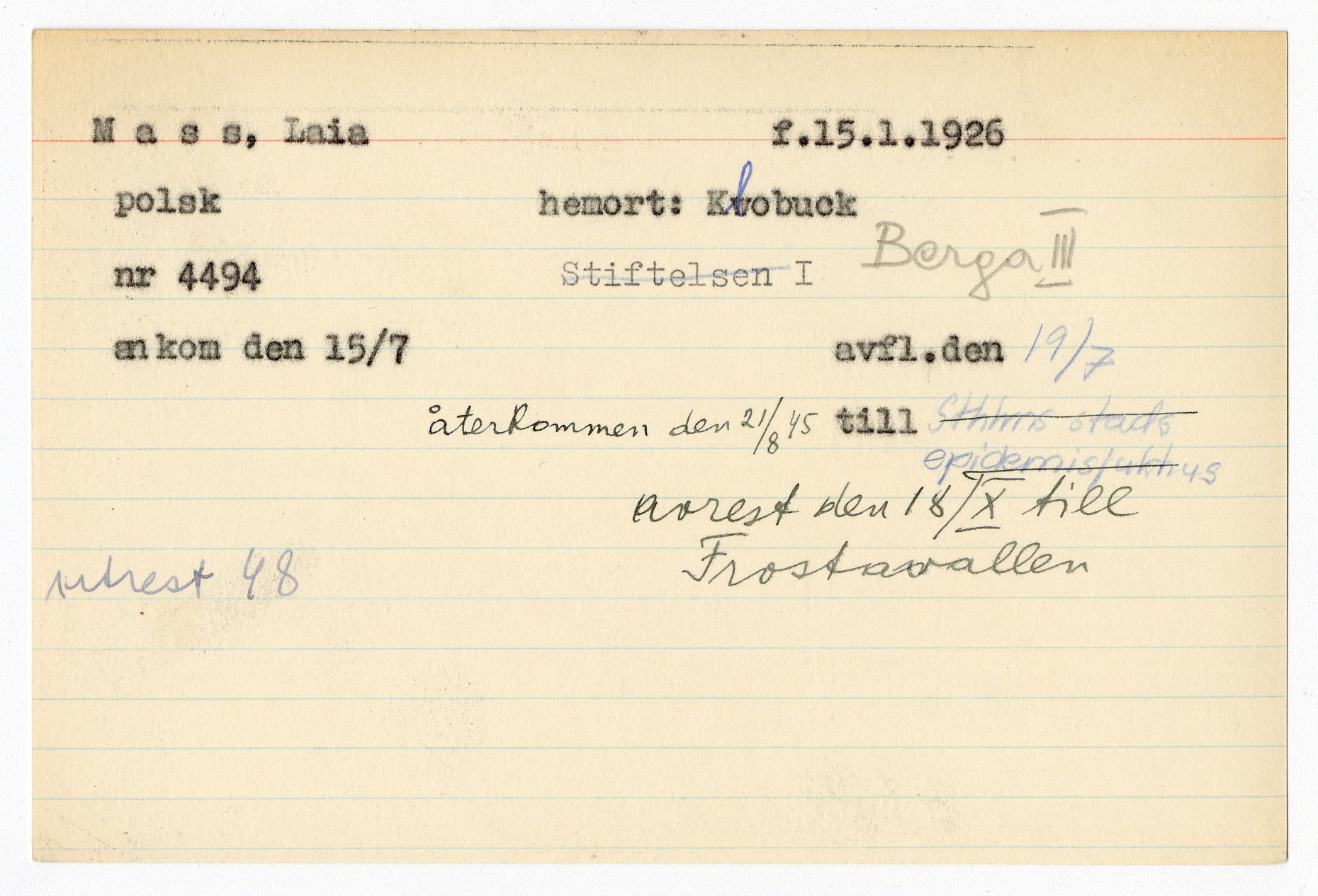 Upphov: Beredskapssjukhuset i Sigtuna. Media: Forum för levande historia. Sveriges museum om Förintelsen/SHM, (PDM) Upphovsrätten till detta verk har gått ut och är därmed fritt att använda på alla sätt. Ange gärna upphovsperson om denne är känd.