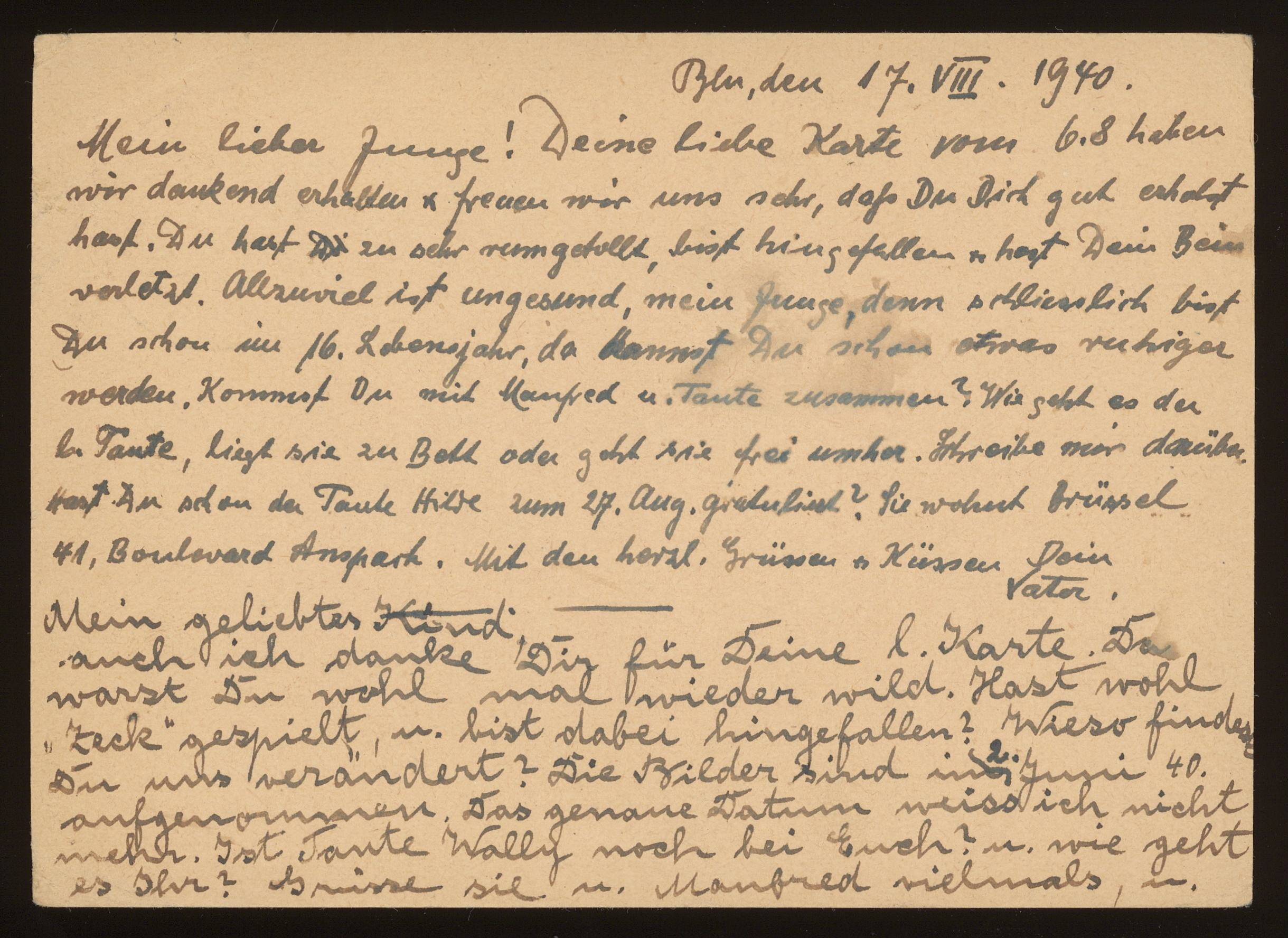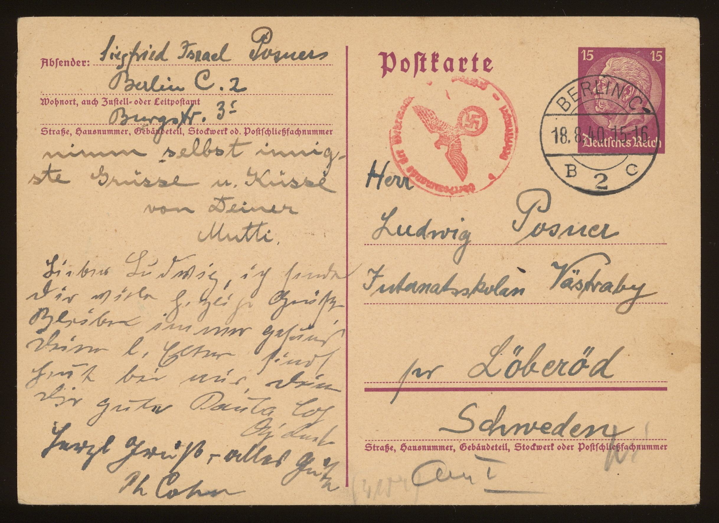 Brevkort från föräldrarna Anna och Siegfried Posner och carl (?) till Ludwig Posner daterat 17 augusti 1940.