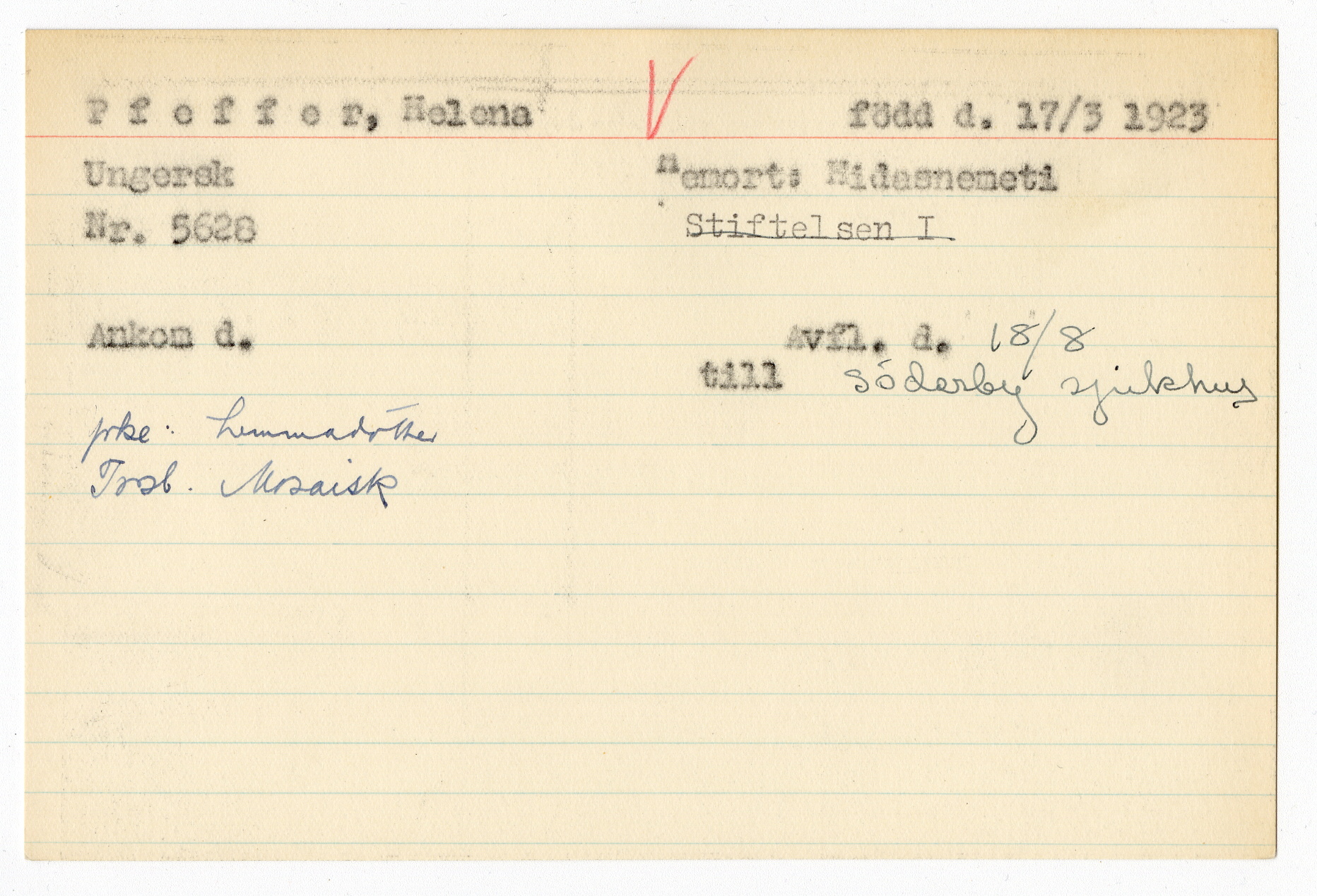 Ett skrivkort med patientuppgifter gällande Helena Pfeffer.
