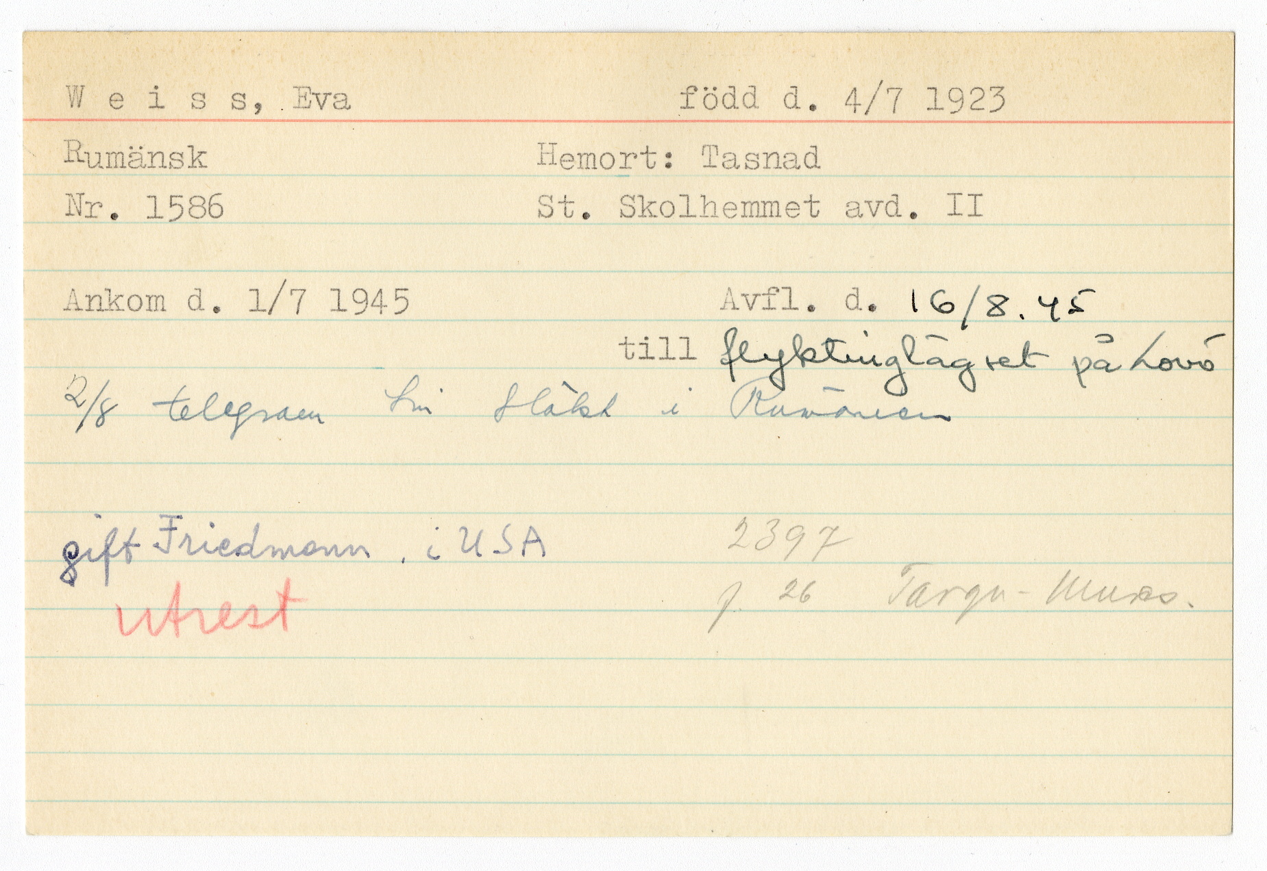 Ett skrivkort med patientuppgifter gällande Eva Friedmann f. Weiss.