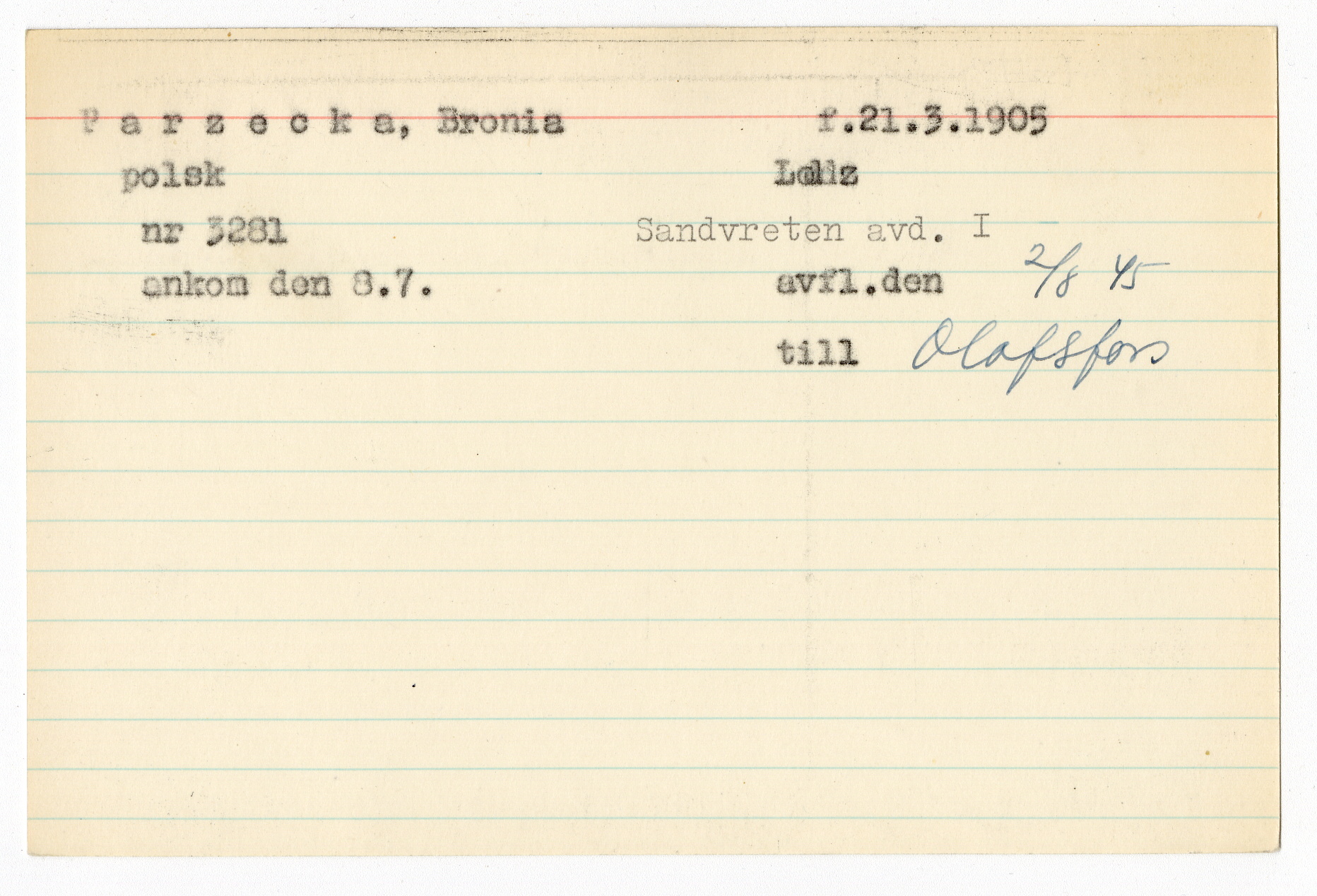 Ett skrivkort med patientuppgifter gällande Bronia Parzecka.