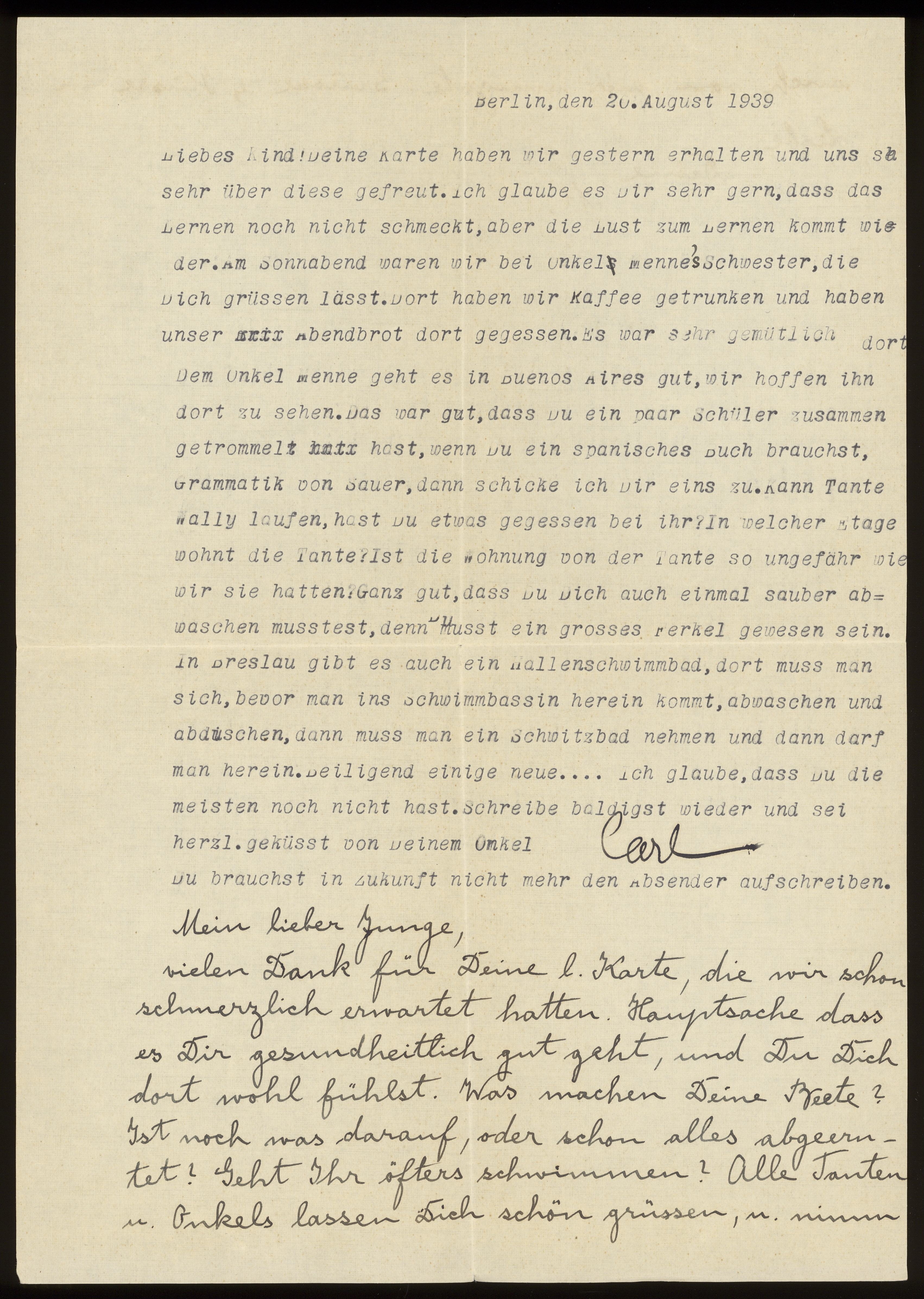Brev från mor Anna Posner och Onkel Carl till Ludwig Posner daterat 20 augusti 1939.