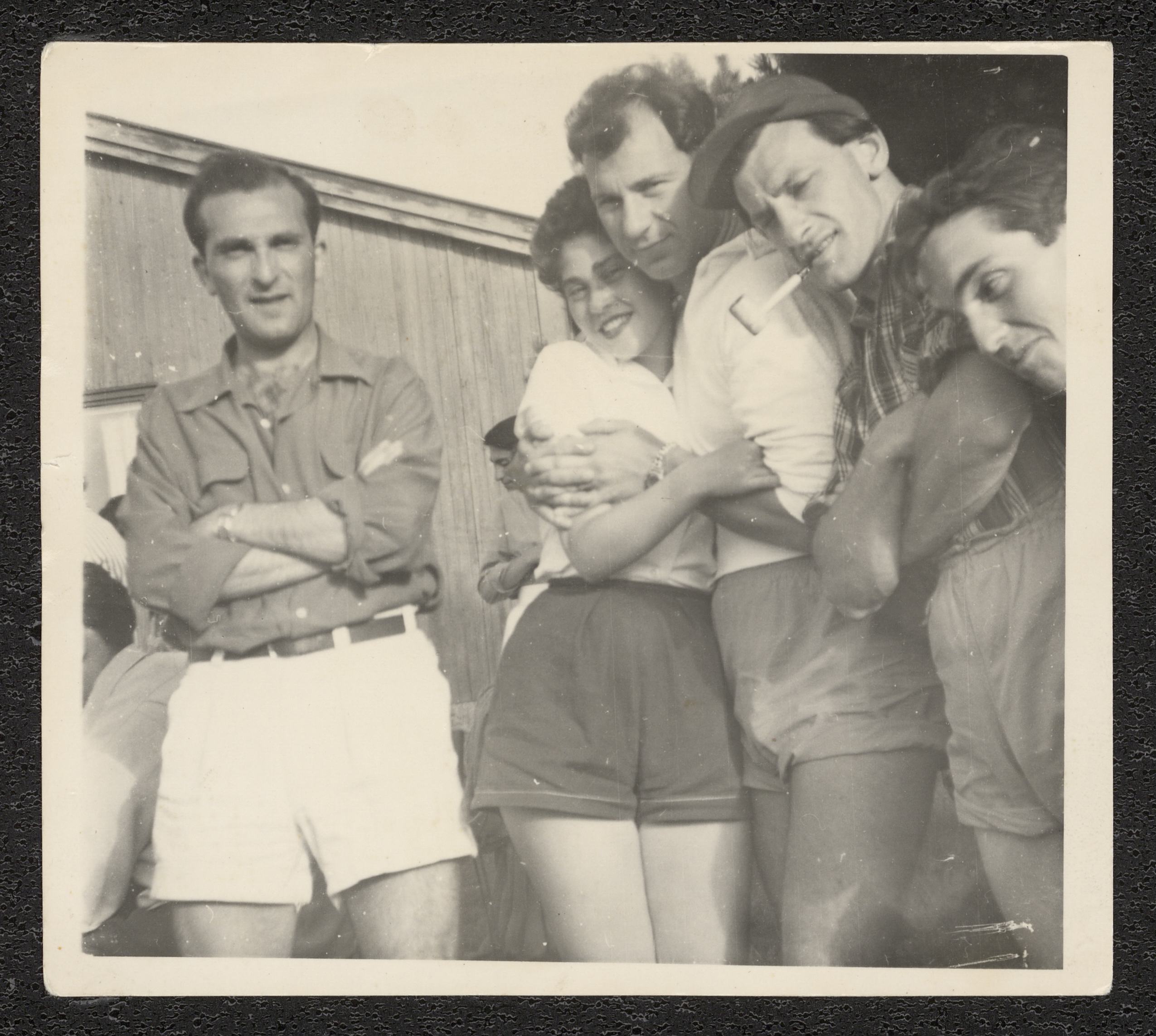 Fyra män och en kvinna ser in i kameran. Mannen längst till vänster har armarna i kors. Bilden har tillhört Georg Witt och är troligen tagen vid en återträff i Uddevalla på 1950-talet.
