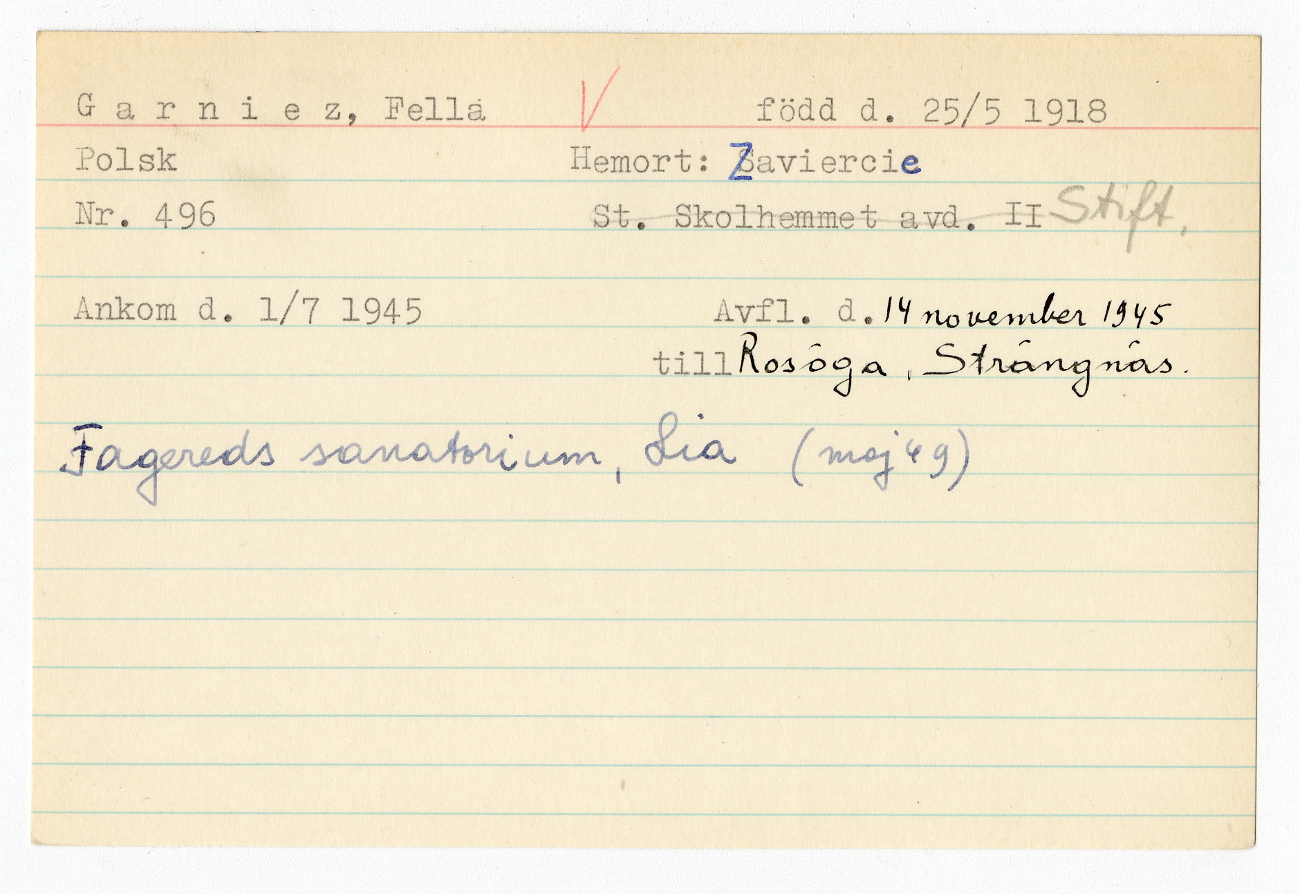 Ett skrivkort med patientuppgifter gällande Fella Garniez.
