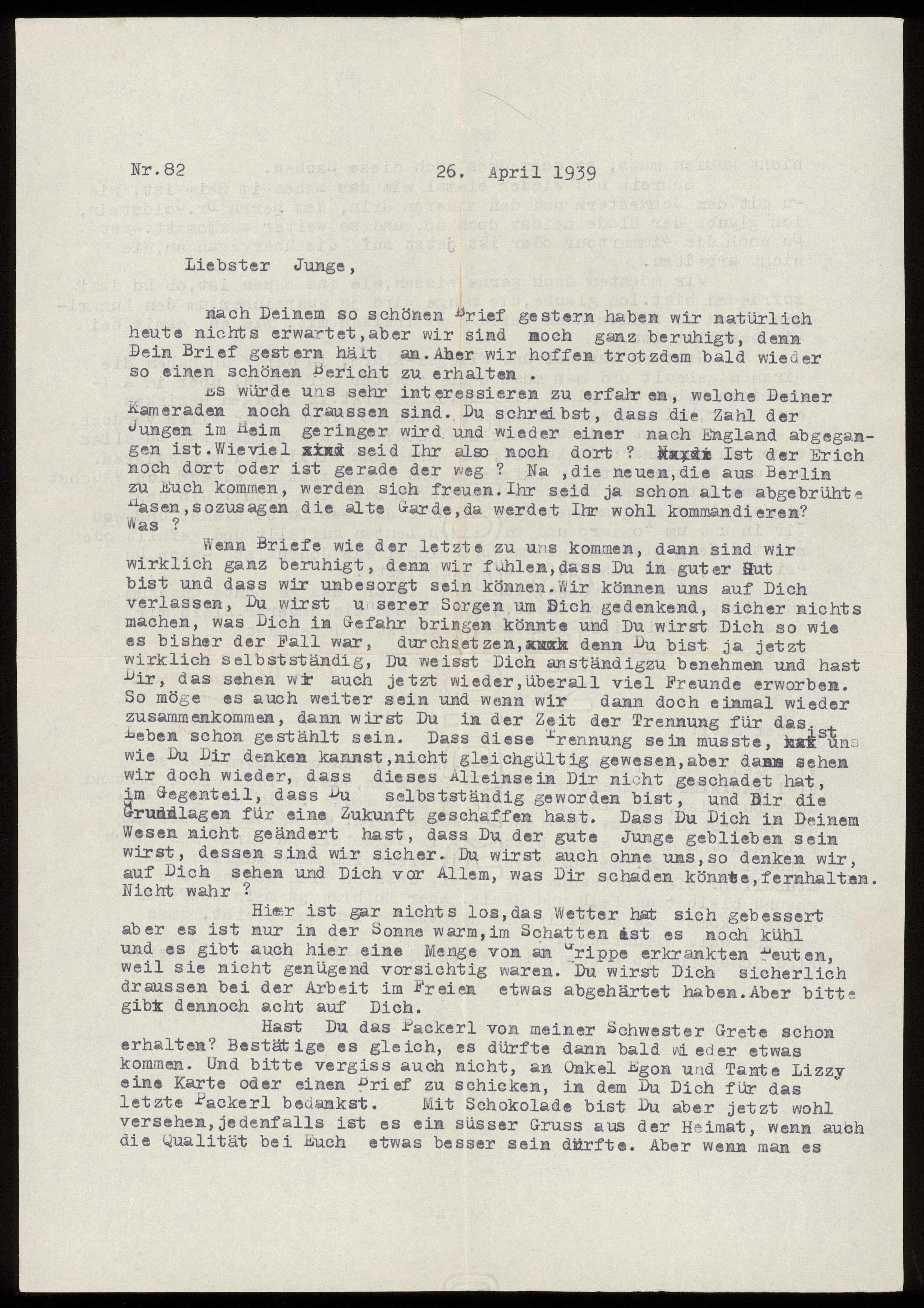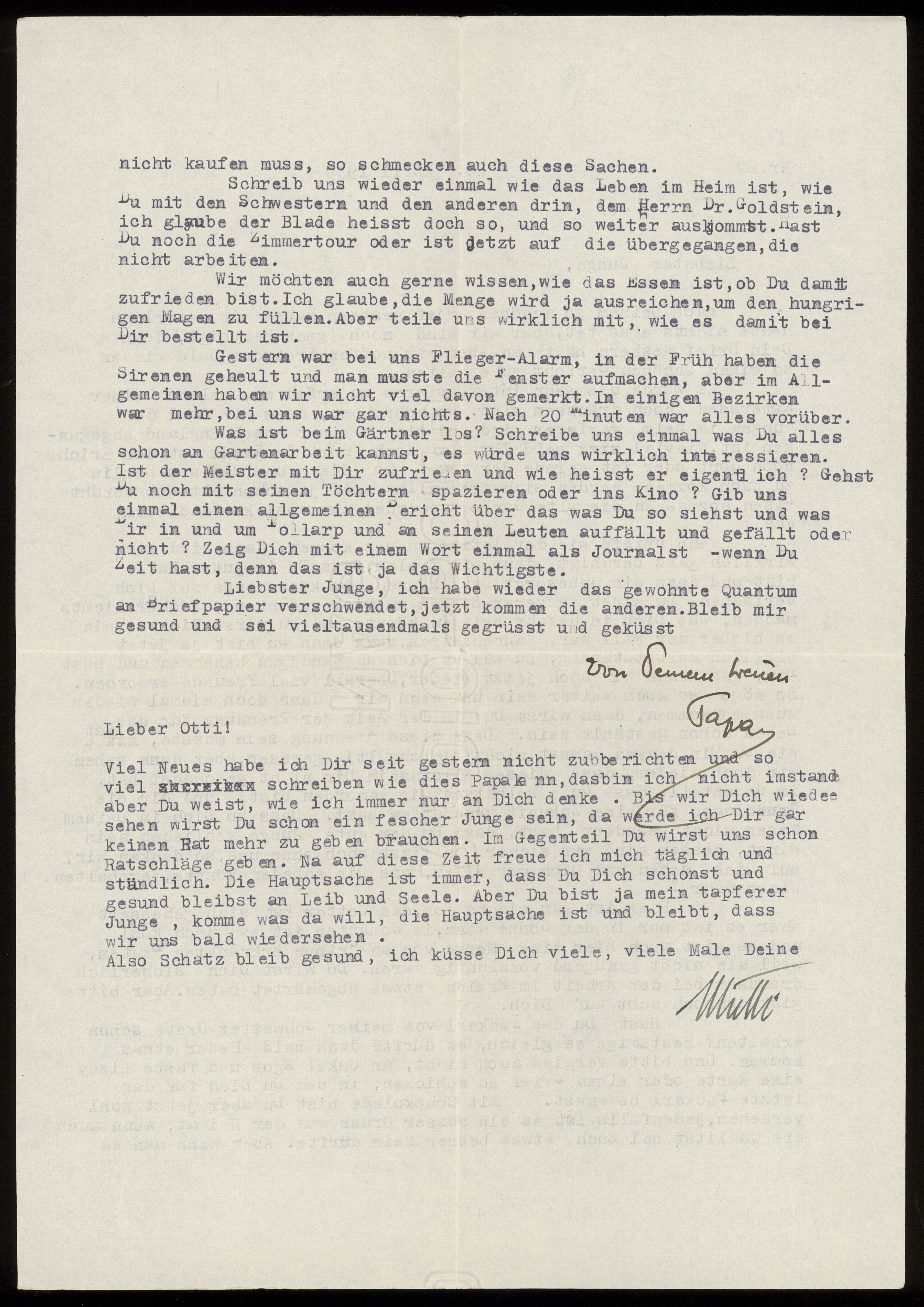 Maskinskrivet brev till Otto Ullman från föräldrarna Josef och Elise Ullmann daterat 26 april 1939 Wien.