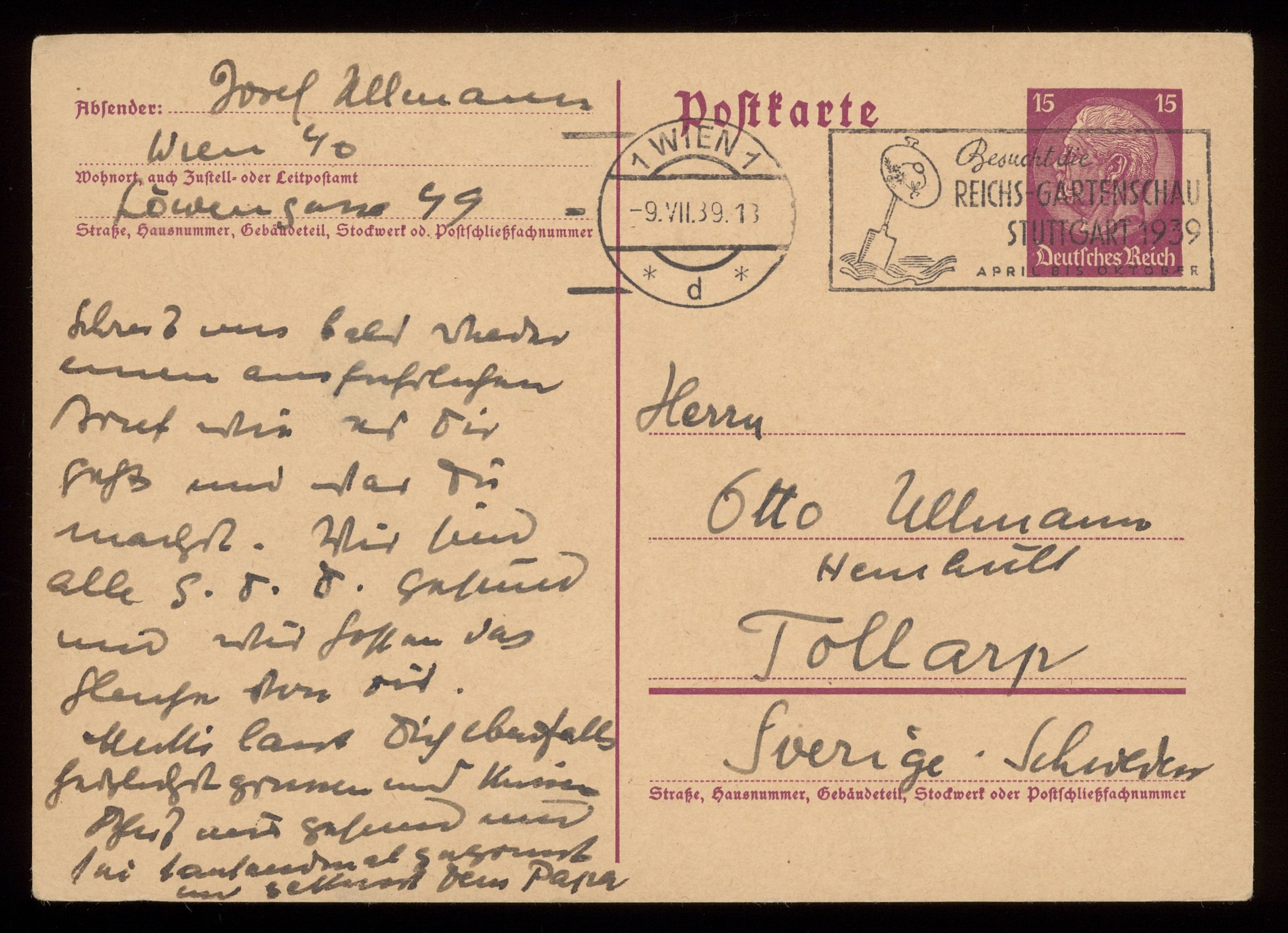 Brev till Otto Ullman från föräldrarna Josef och Elise Ullmann daterat 9 juli 1939 Wien.
