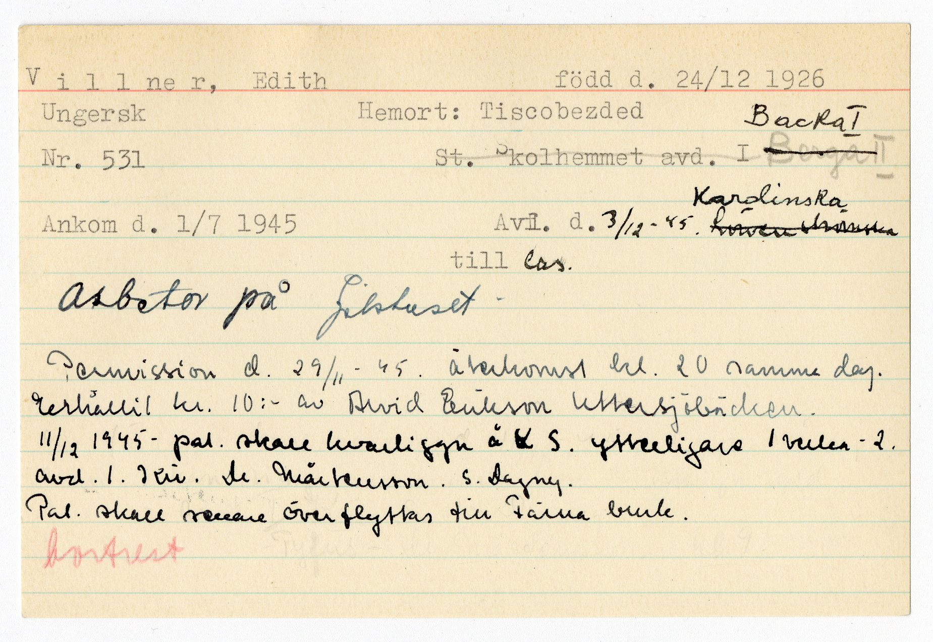 Ett skrivkort med patientuppgifter gällande Edith Villner.