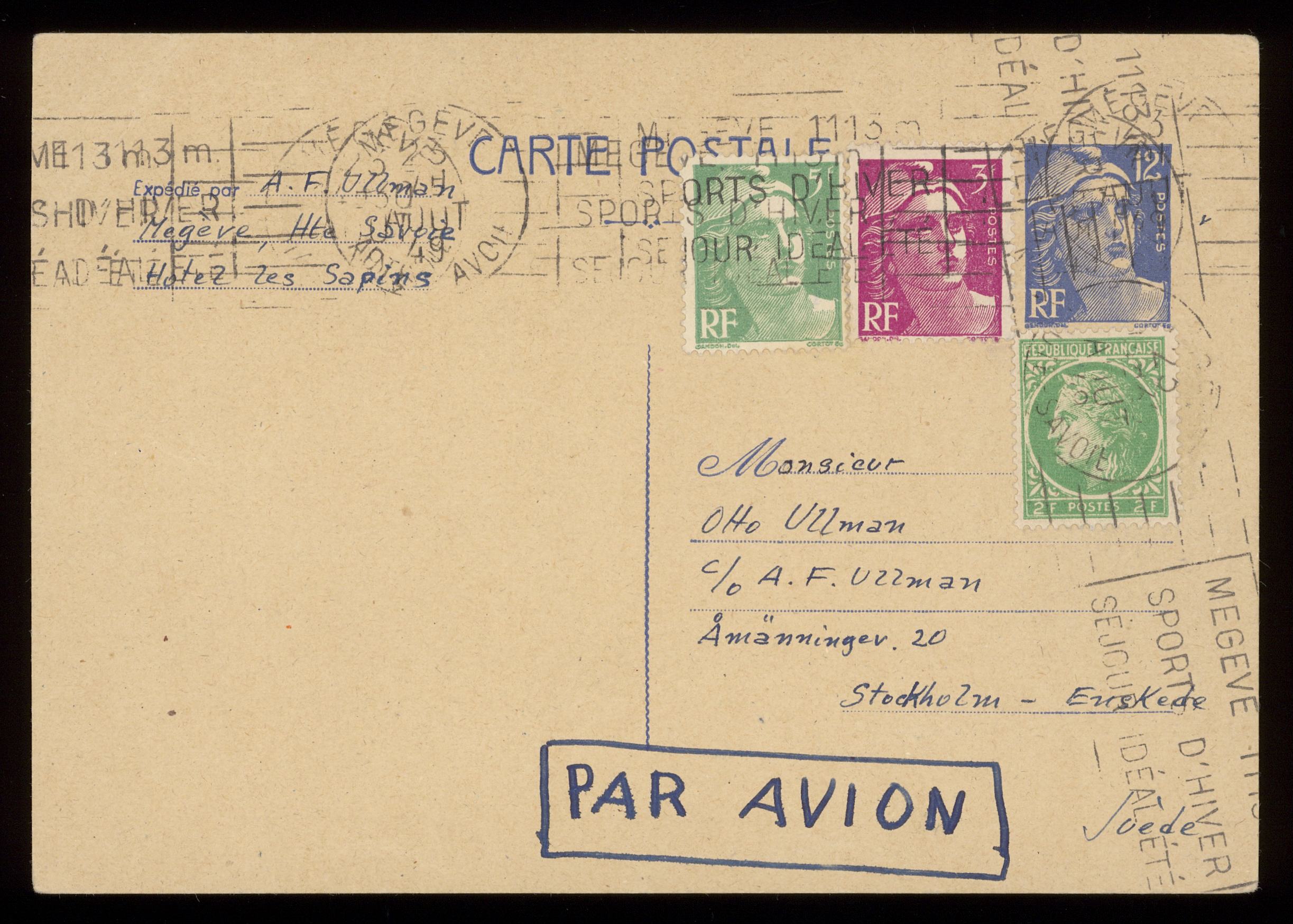 Brev till Otto Ullman från Alexander "Bobby" och Selma "Teddy" Ullmann 22 augusti 1949 Megeve.