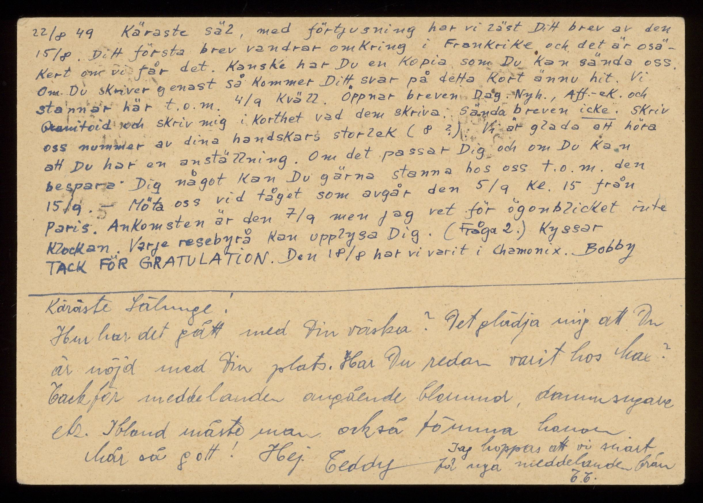 Brev från Alexander "Bobby" och Selma "Teddy" Ullmann 1949-08-22