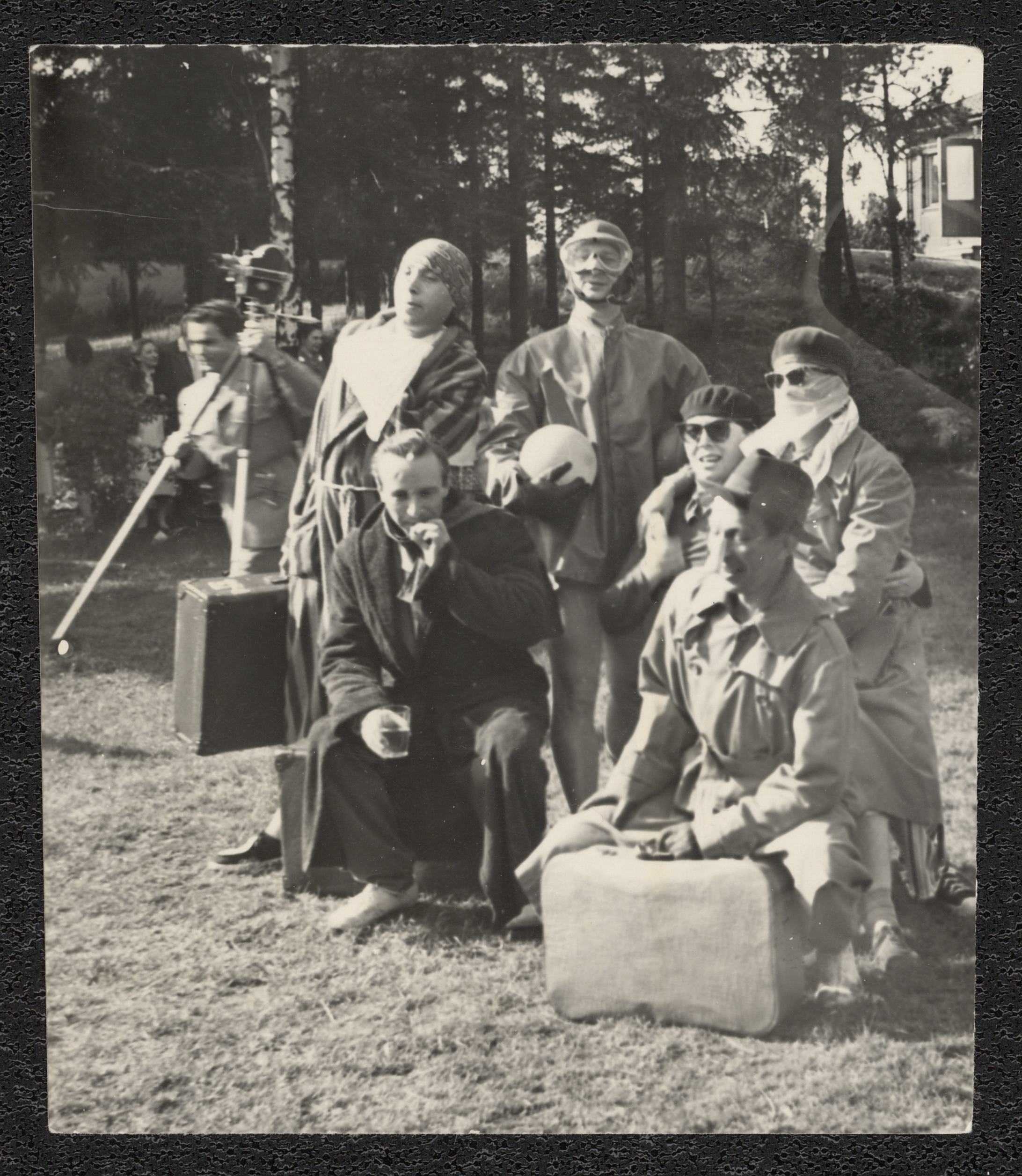 Lekar vid en återträff för överlevande i Uddevalla på 1950-talet. Sex personer är samlade på en gräsplätt iförda olika utklädnader. I bakgrunden går en man med filmkamera.