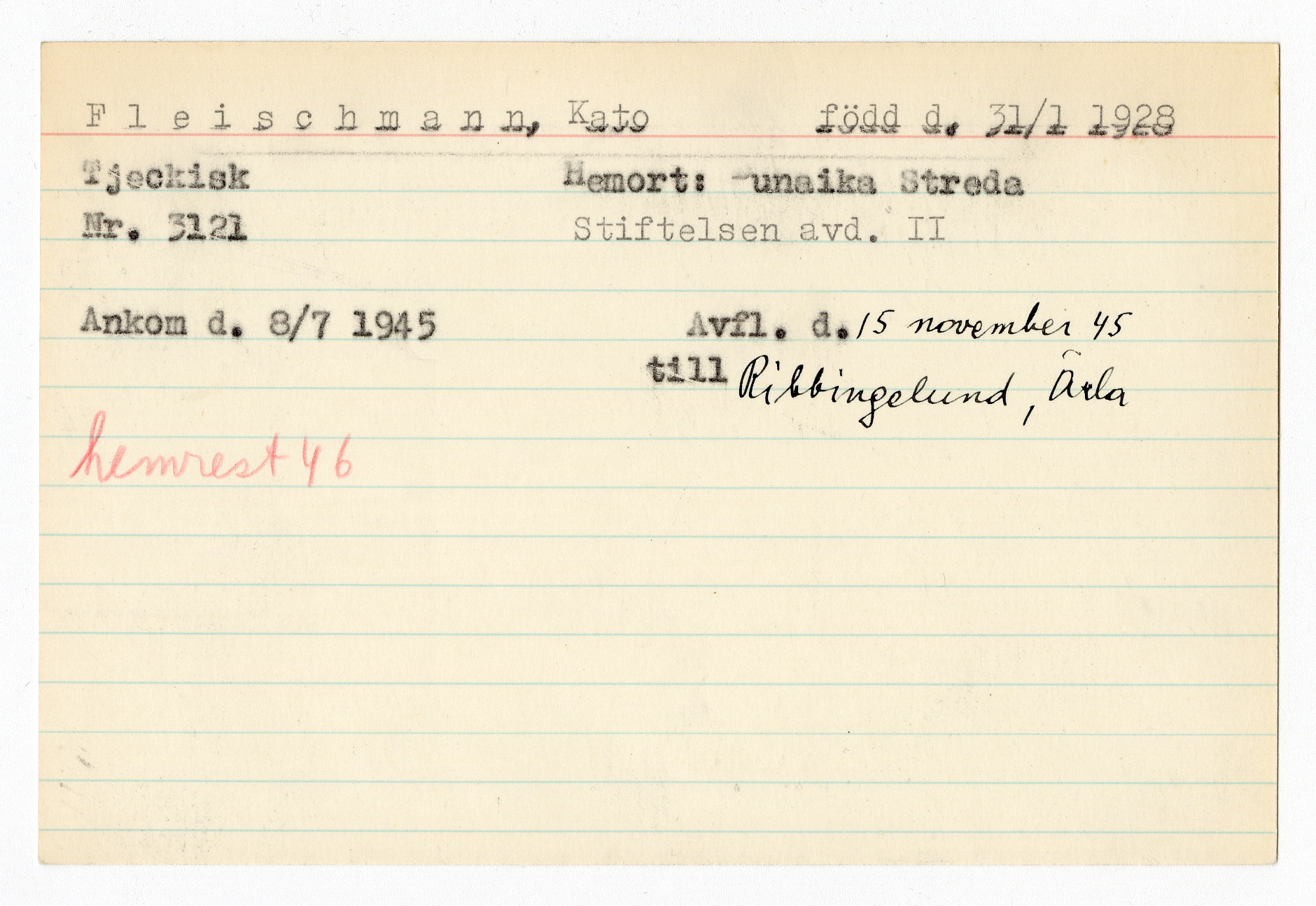 Ett skrivkort med patientuppgifter gällande Kato Fleischmann.