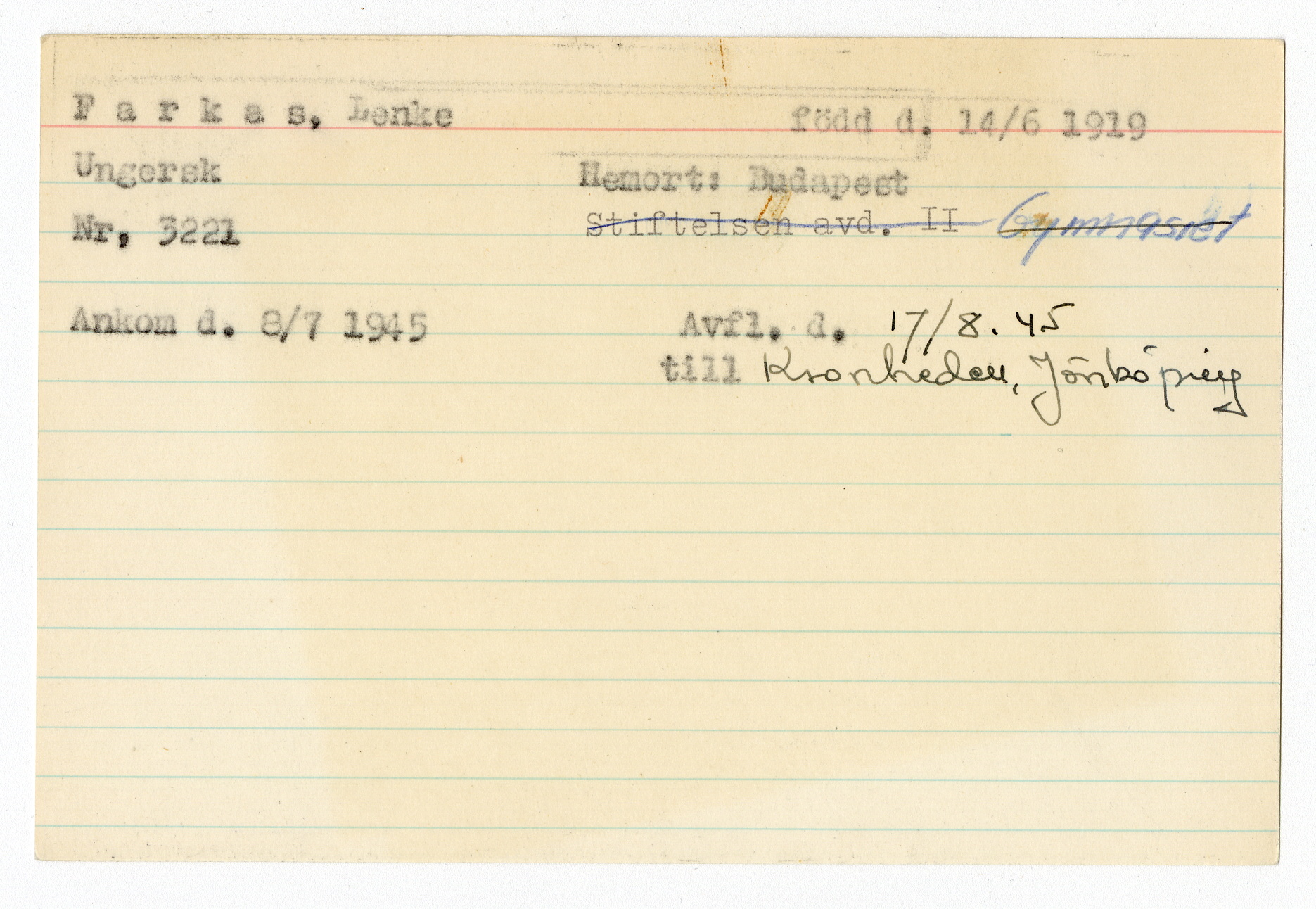 Ett skrivkort med patientuppgifter gällande Lenke Farkas.
