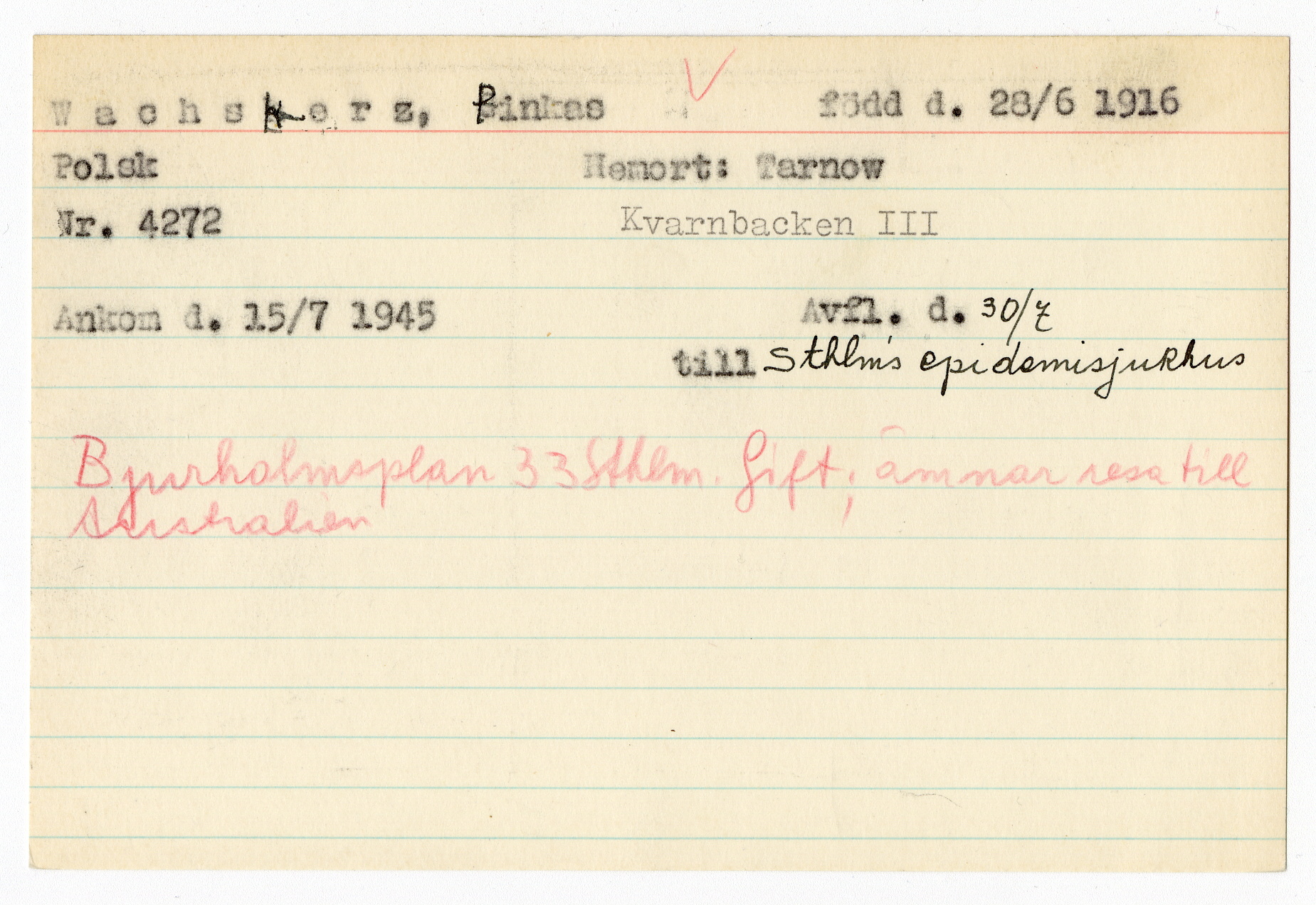 Ett skrivkort med patientuppgifter gällande Pinkas Wachskerz.