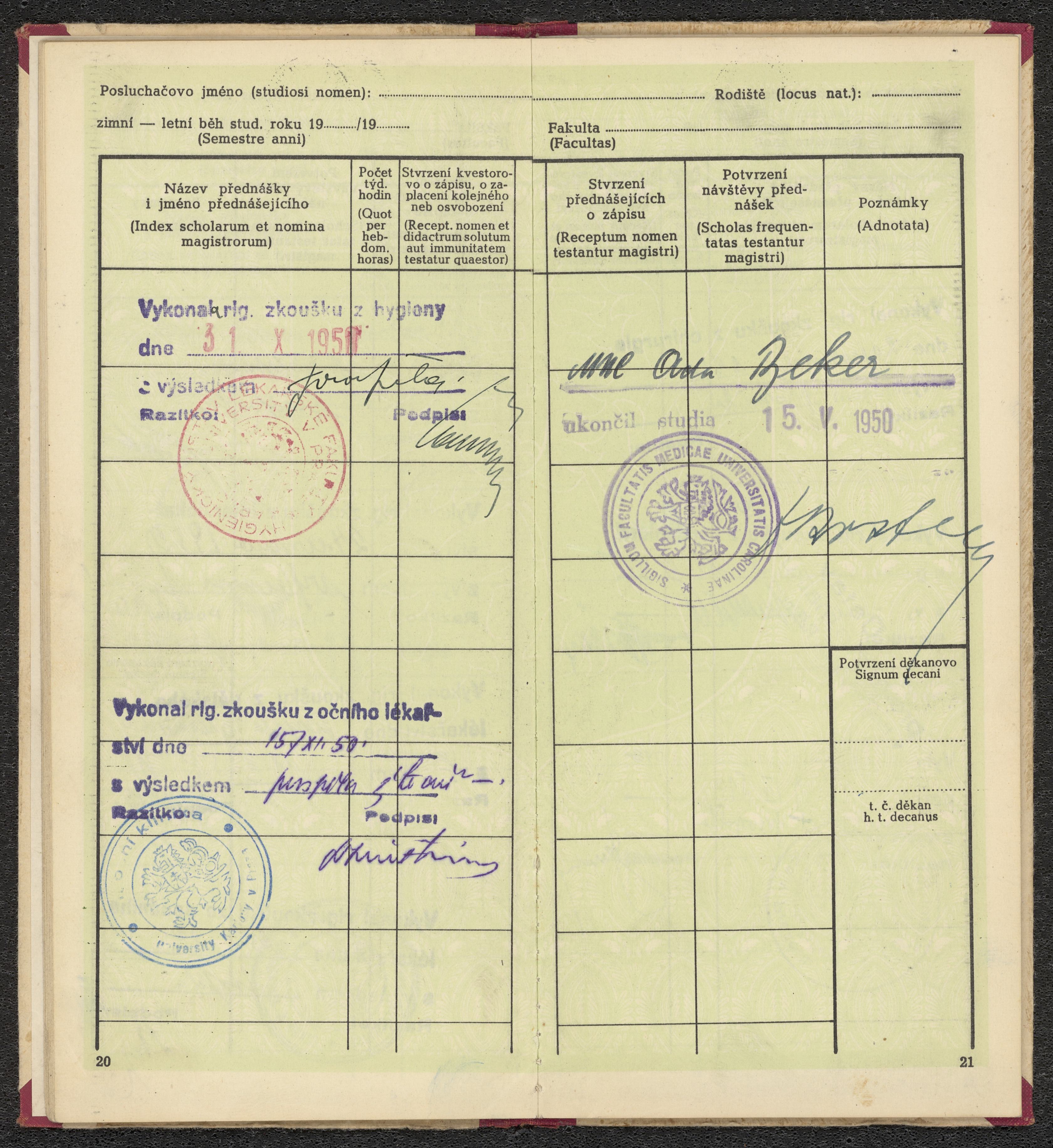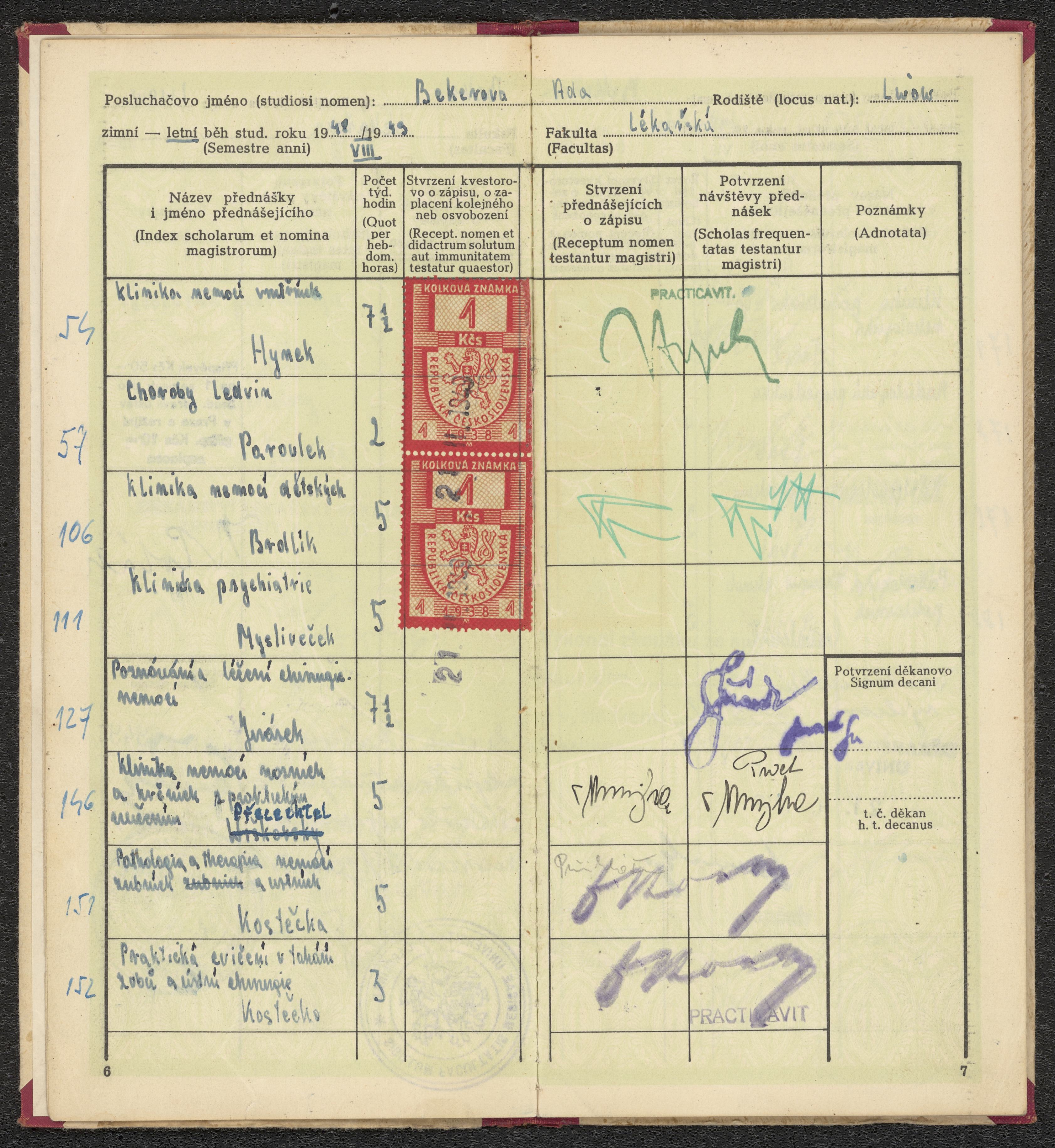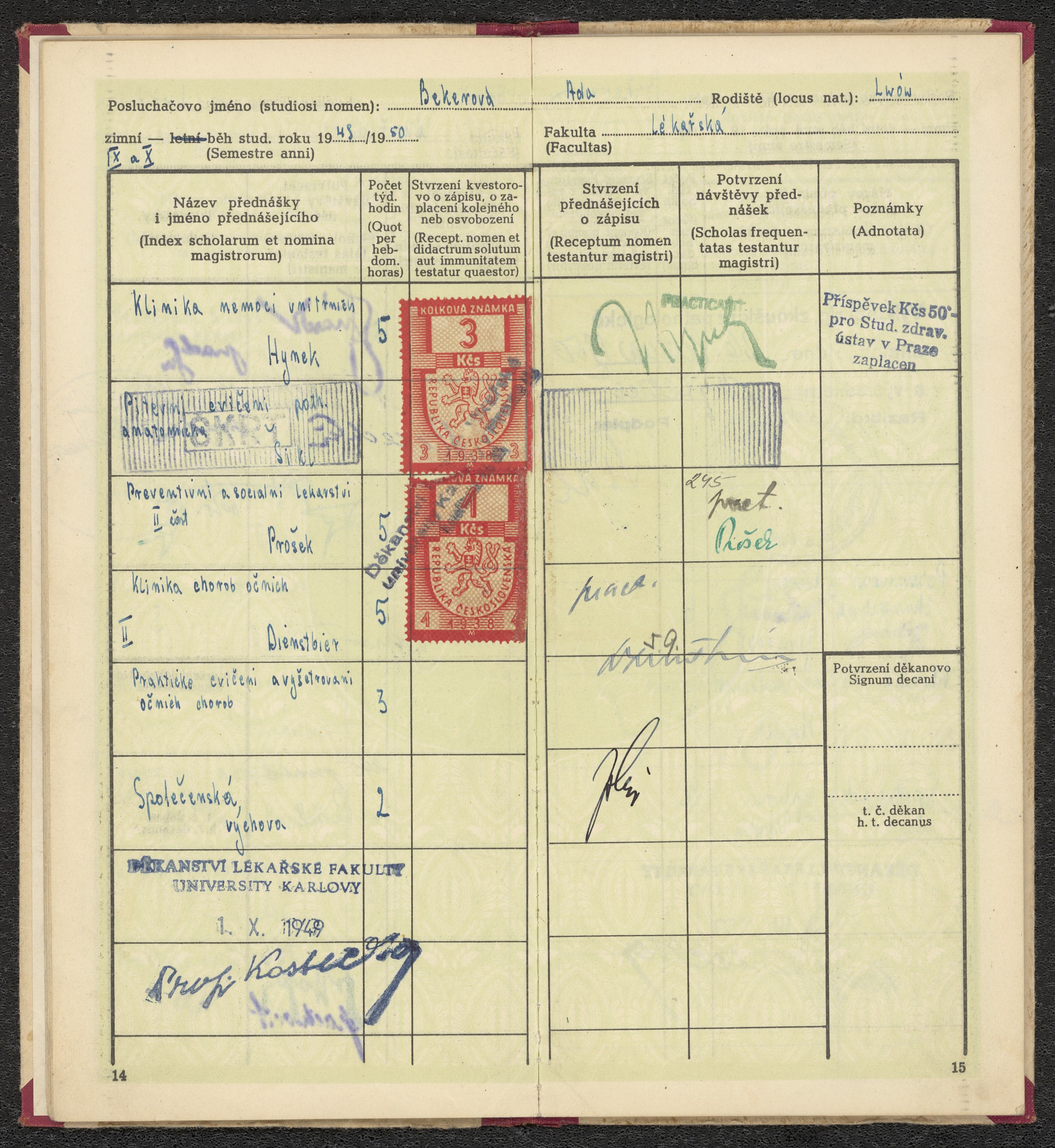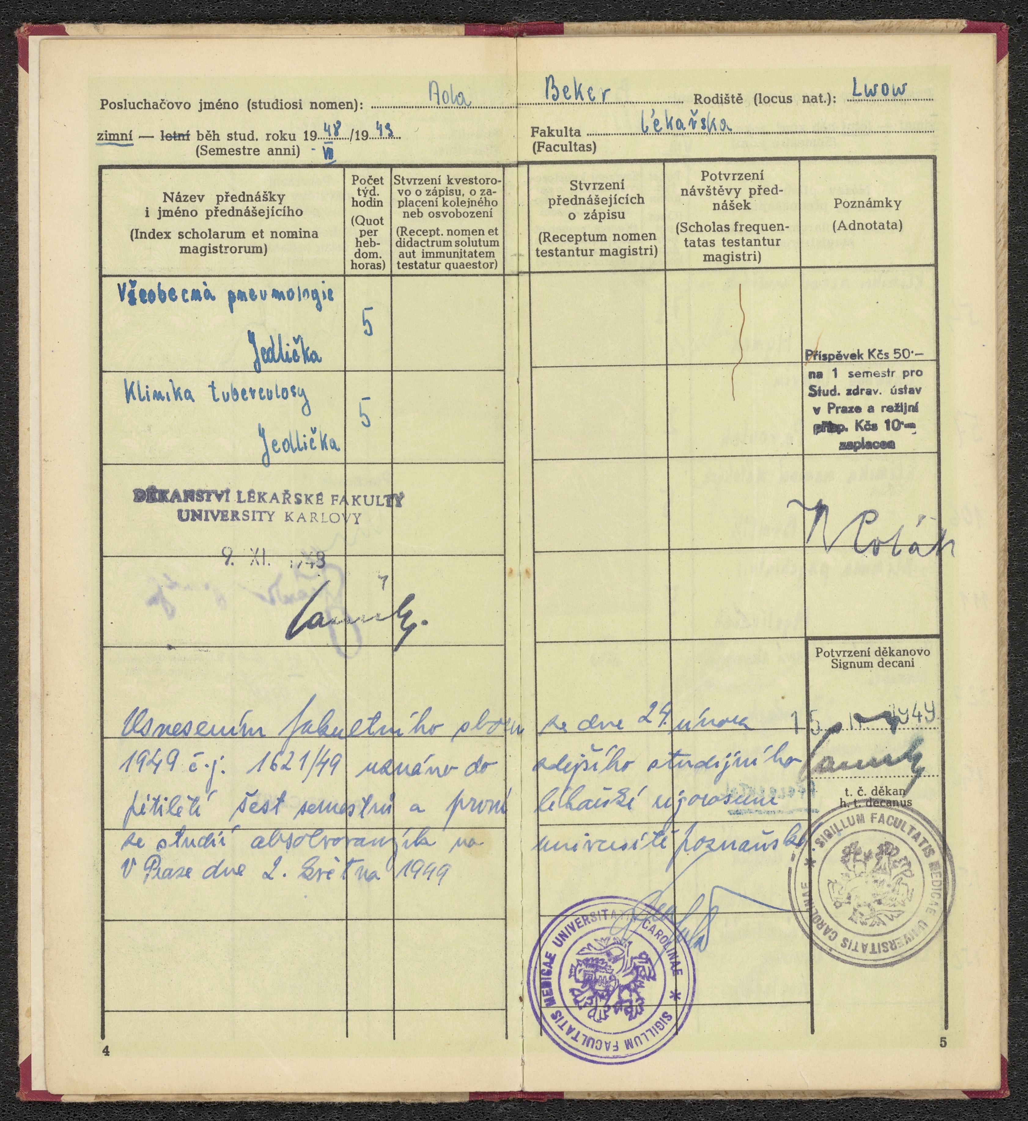 Betygsbok från Universitetet i Prag för Ada Beker (sic.). Utställd 19 november 1948.