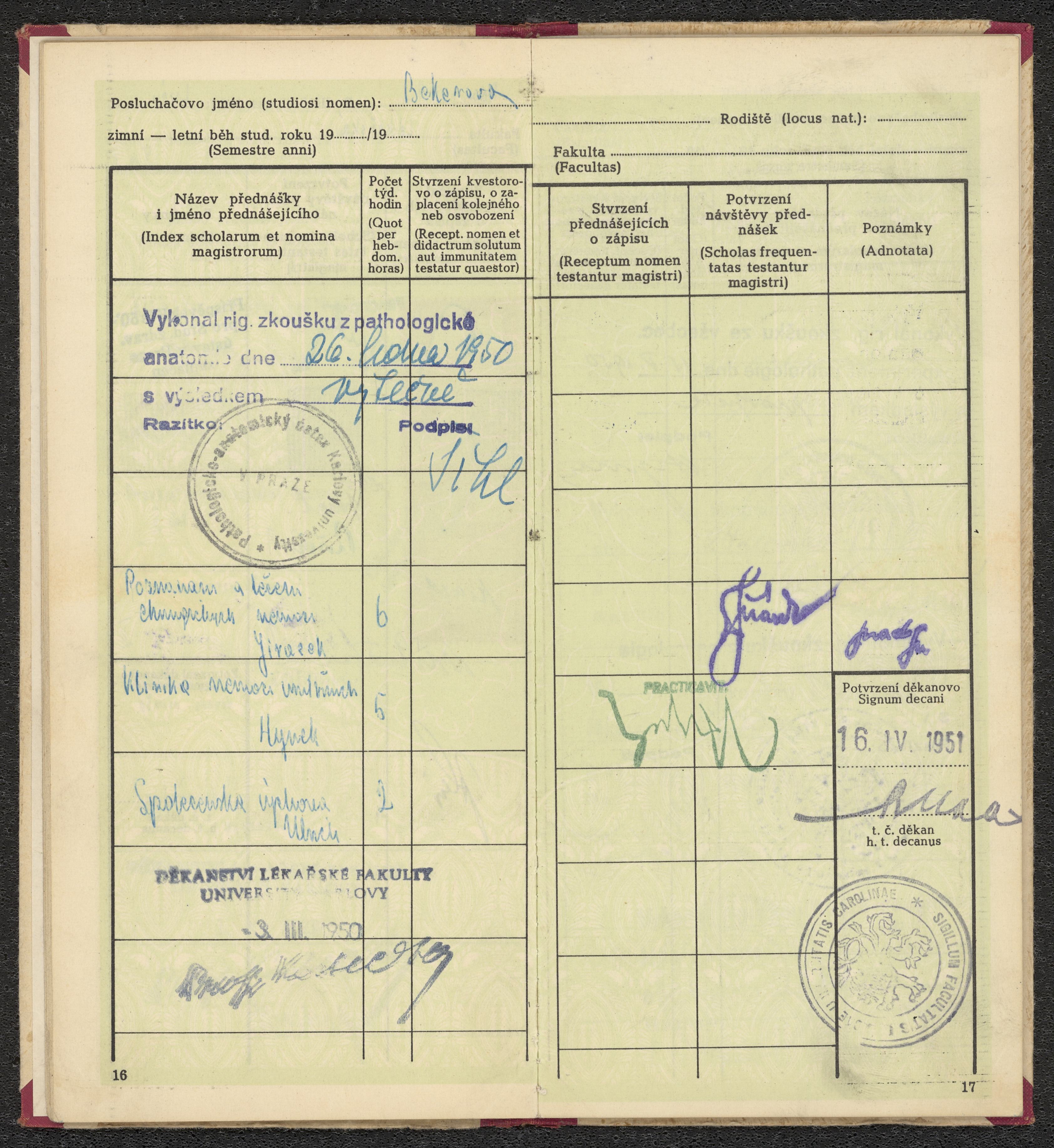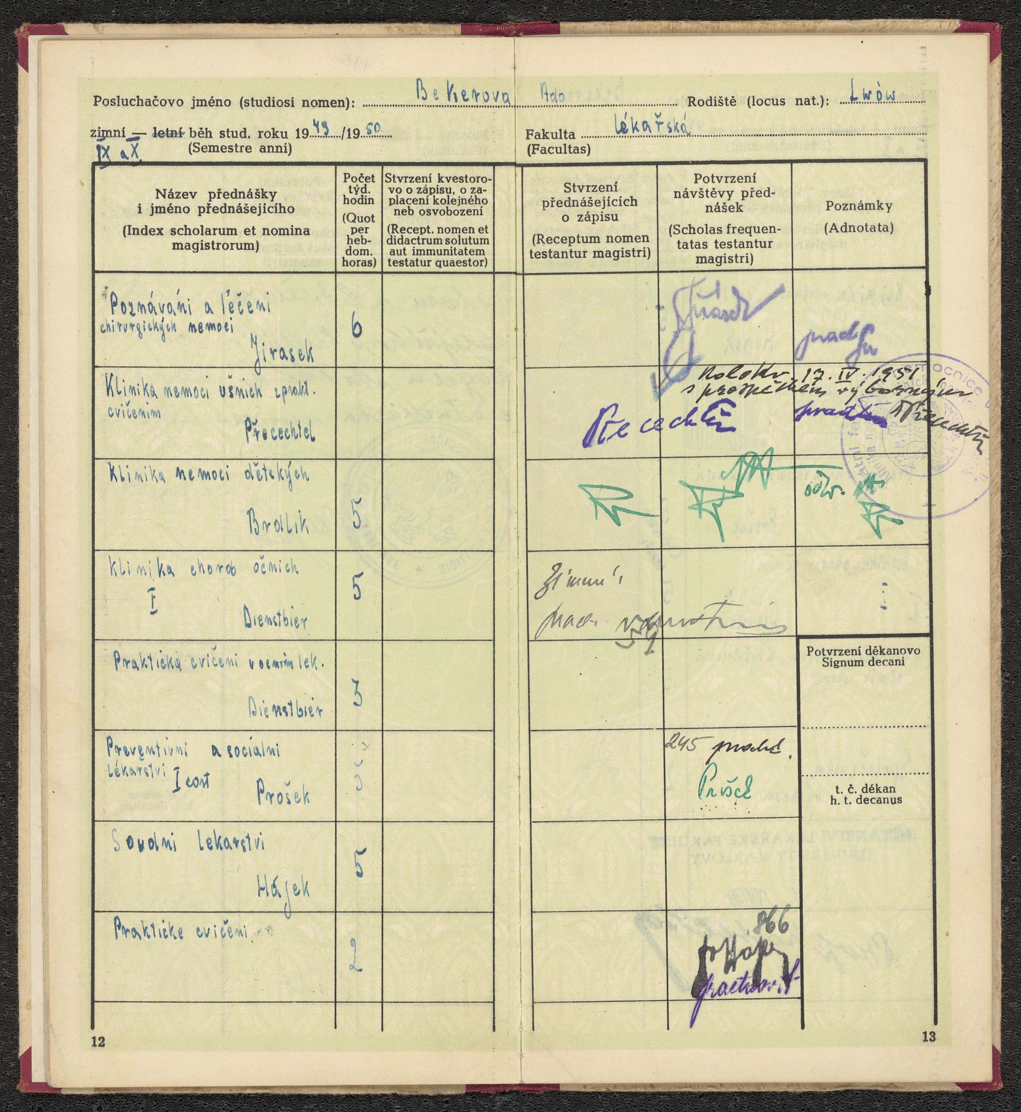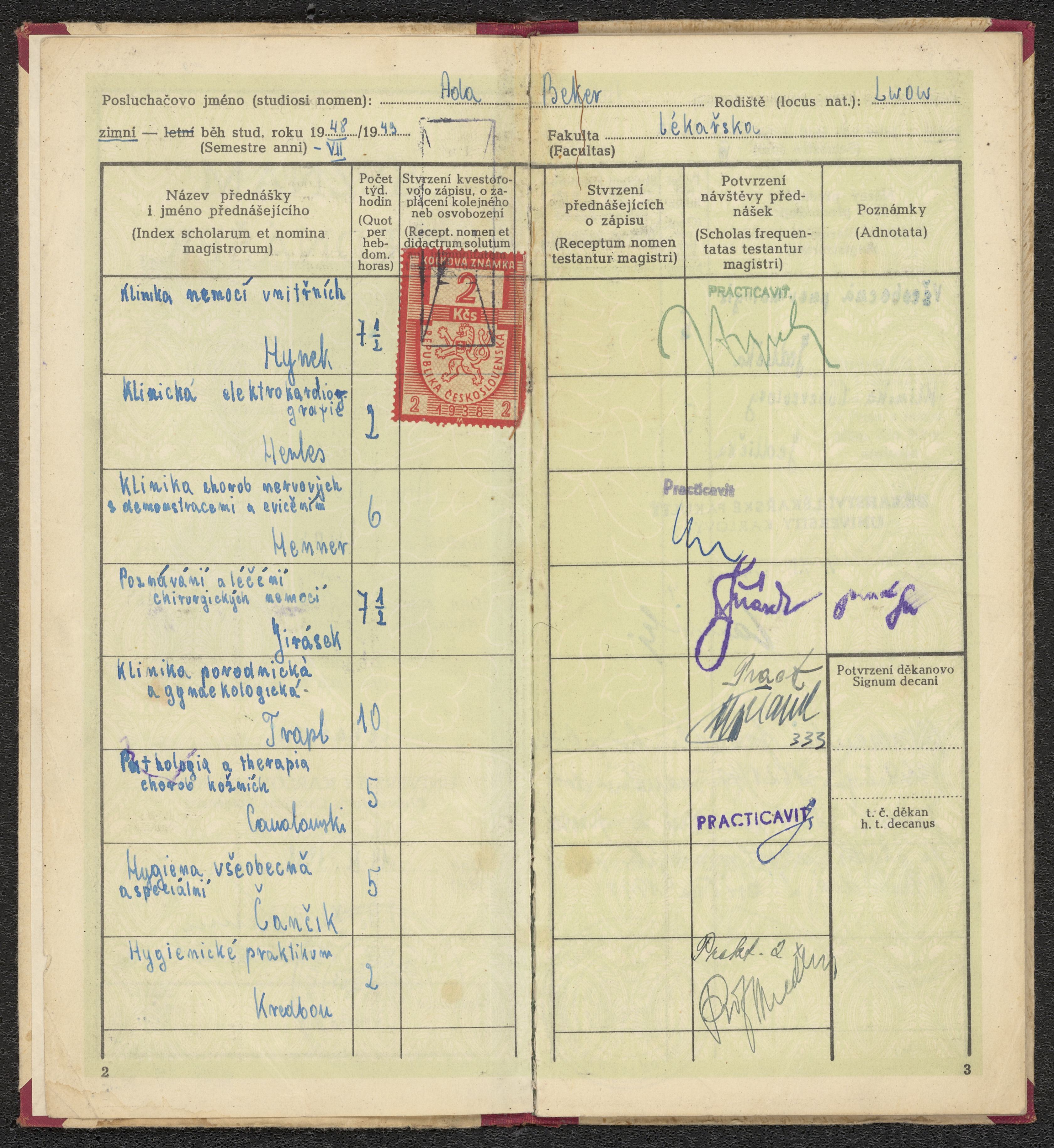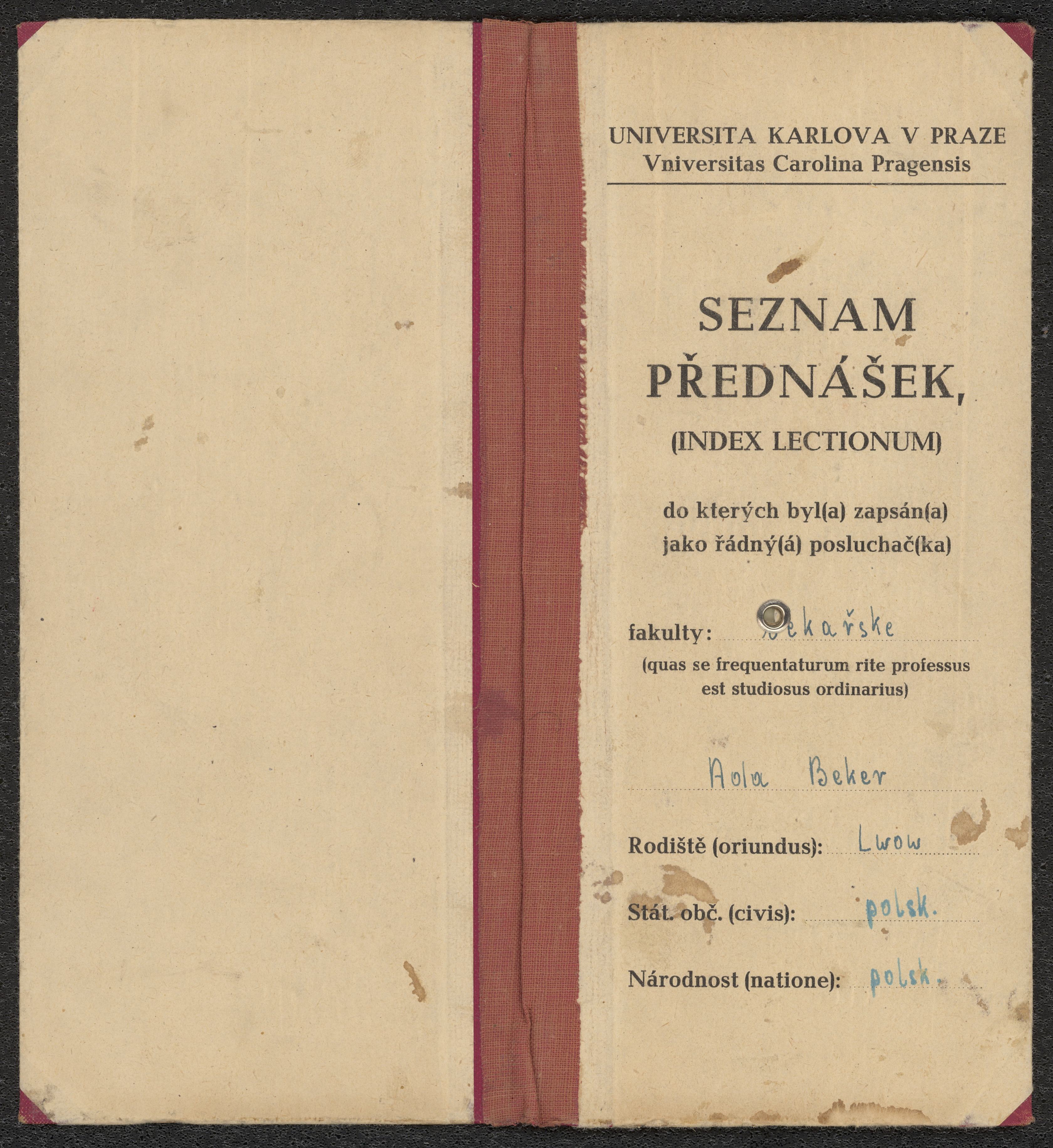 Betygsbok från Universitetet i Prag för Ada Beker (sic.). Utställd 19 november 1948.