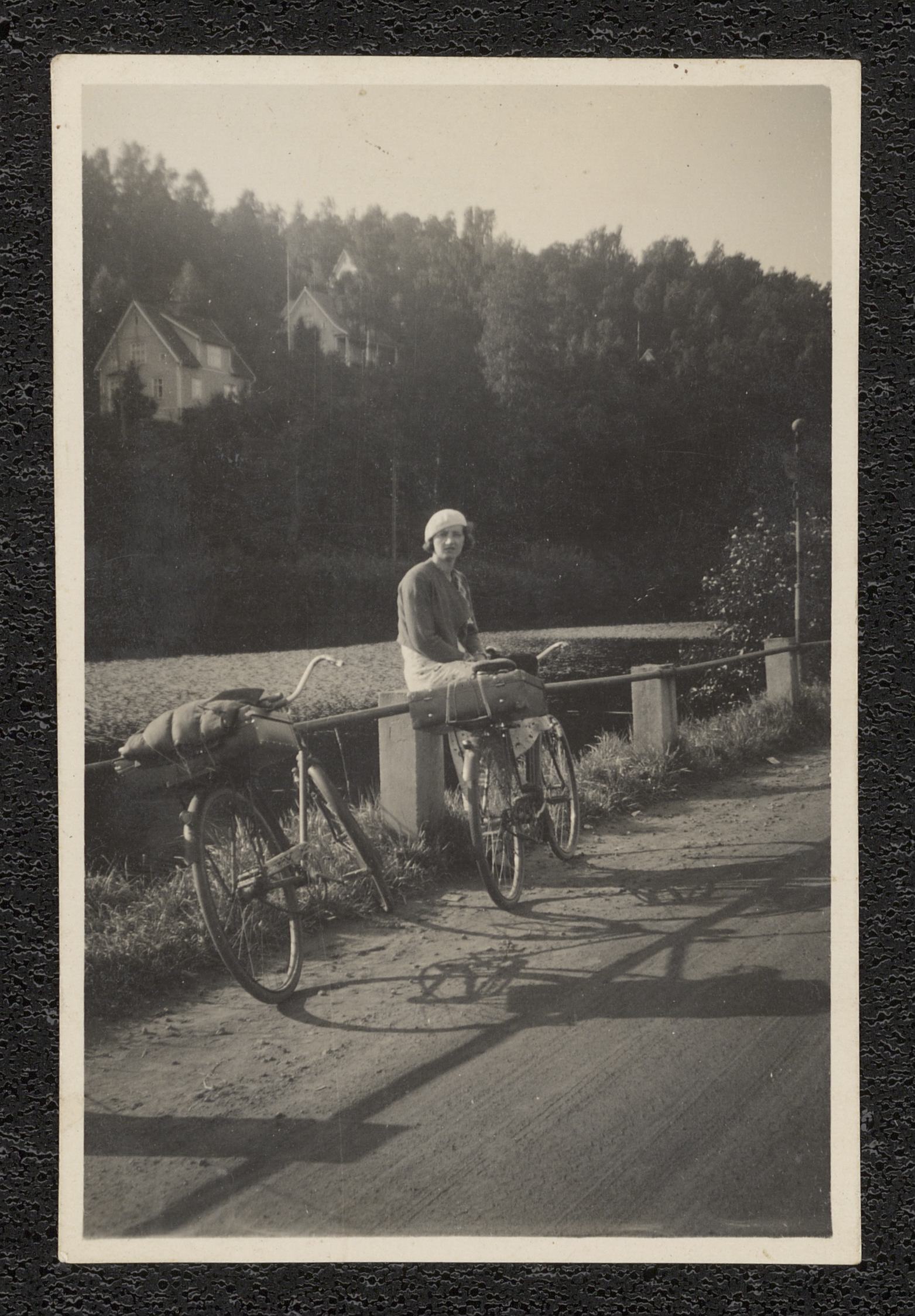 En kvinna sitter på ett vägräcke invid två cyklar. I bakgrunden syns villor bland träden på en sluttning. Bildens ursprung är okänt, men har tillhört Rosa Gustafsson. Kvinnan är möjligen en av de överlevande som kom till Visingsö 1945.