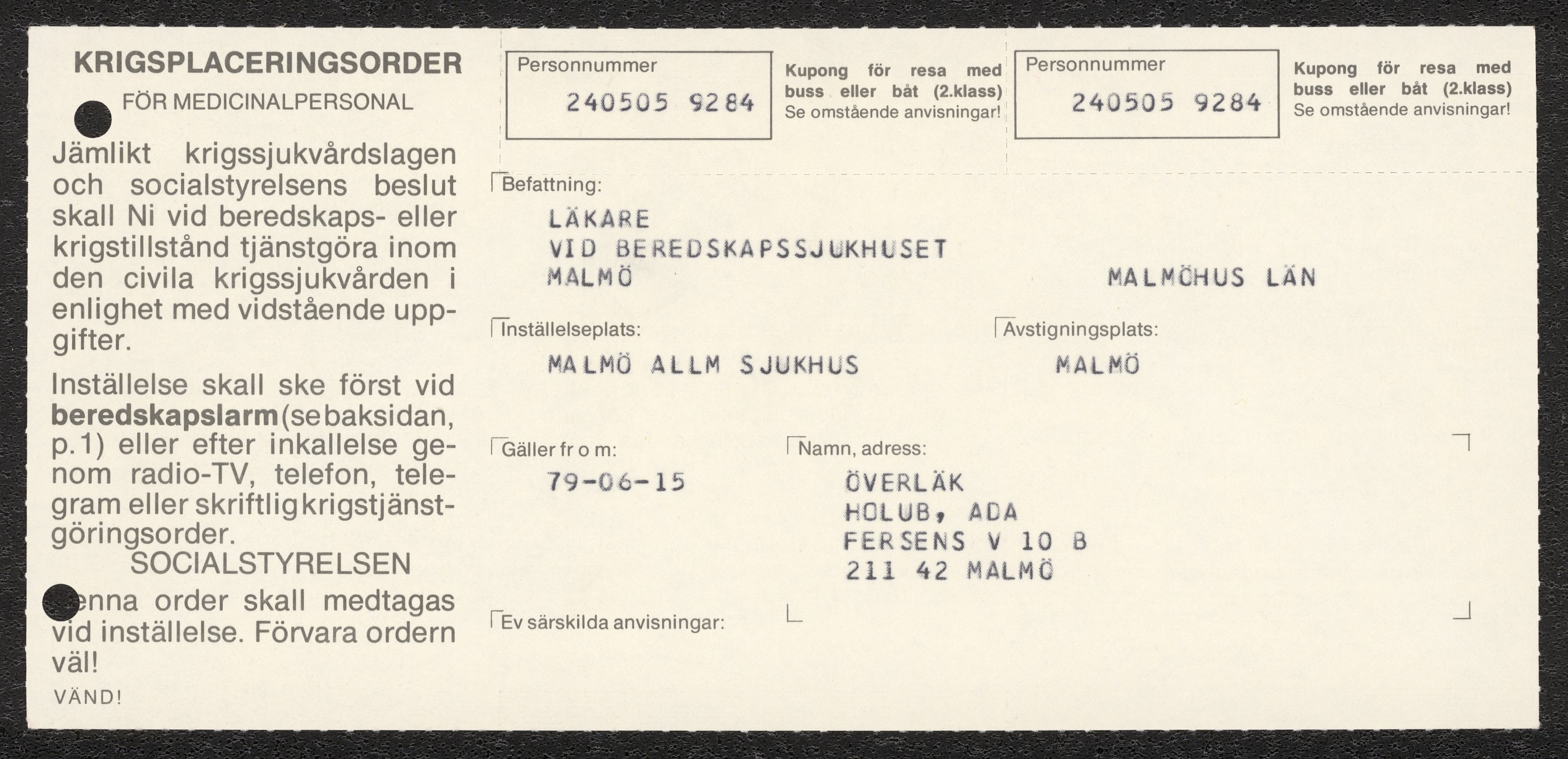 Krigsplaceringsordrar för Ada Holub 1977-81