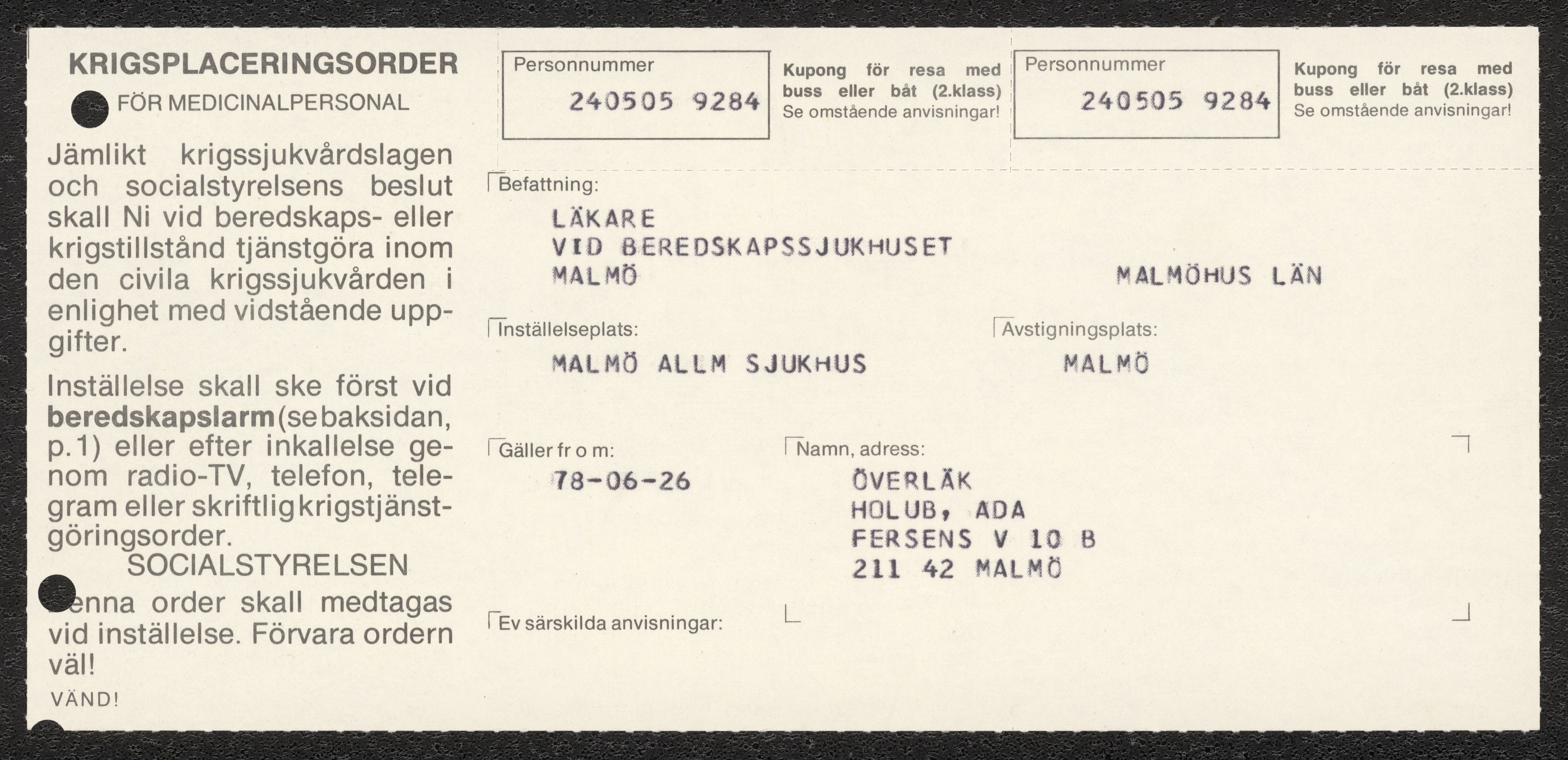Fyra st krigsplaceringsordrar för Ada Holub från tiden som läkare i Malmö.