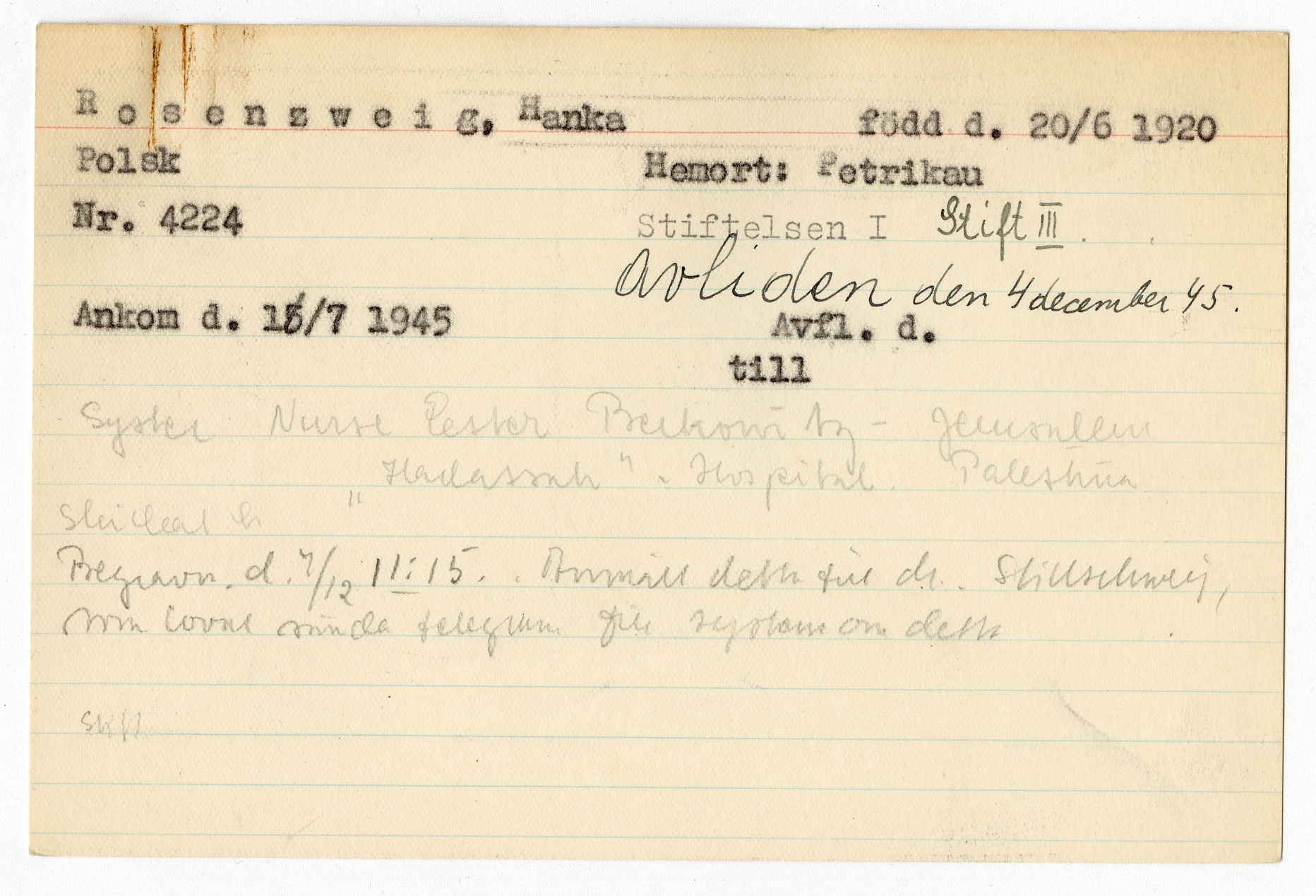 Ett skrivkort med patientuppgifter gällande Hanka Rosenzweig.