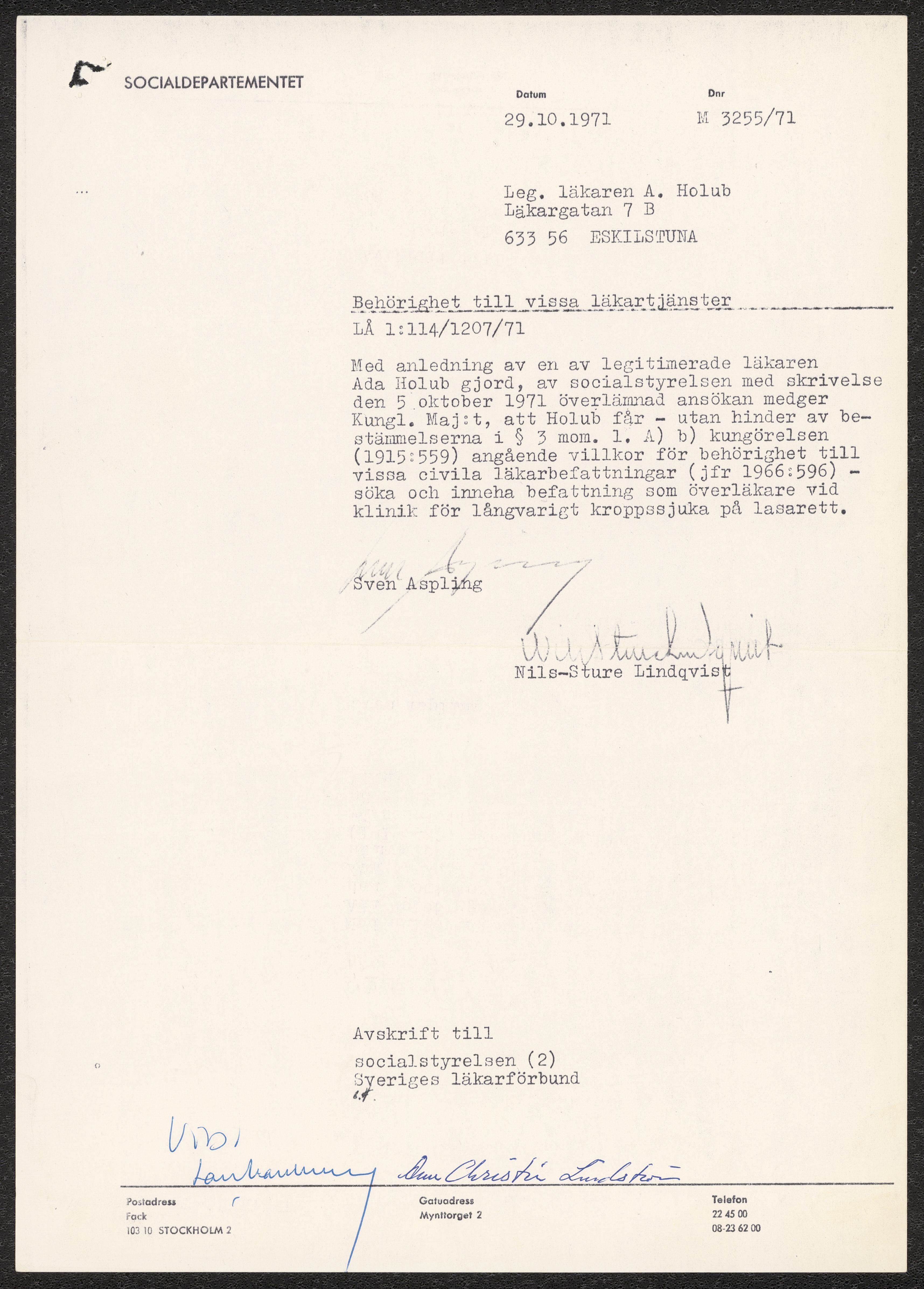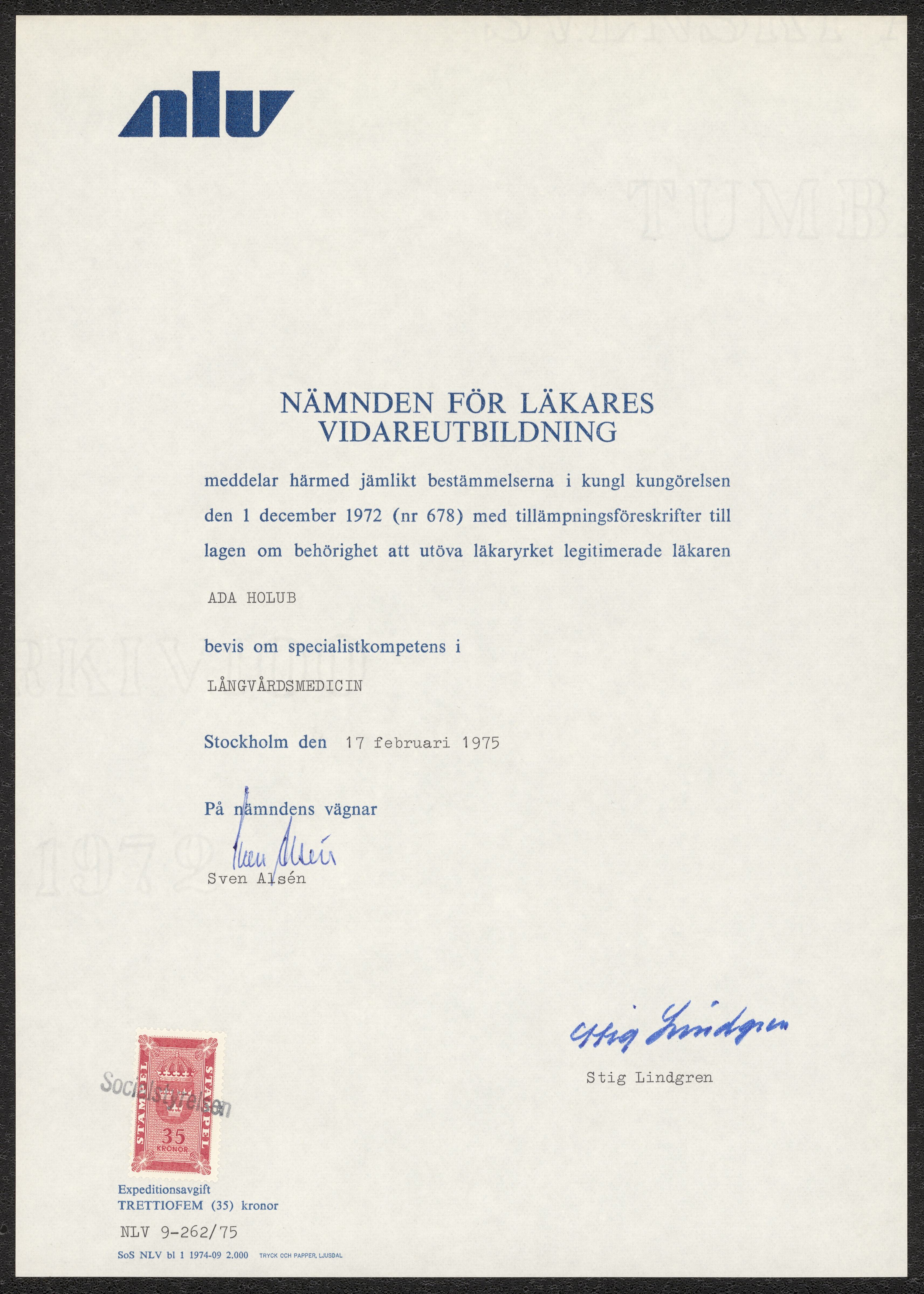 Handlingar rörande Ada Holubs ansökan om specialistkompetens inom långvårdsmedicin.