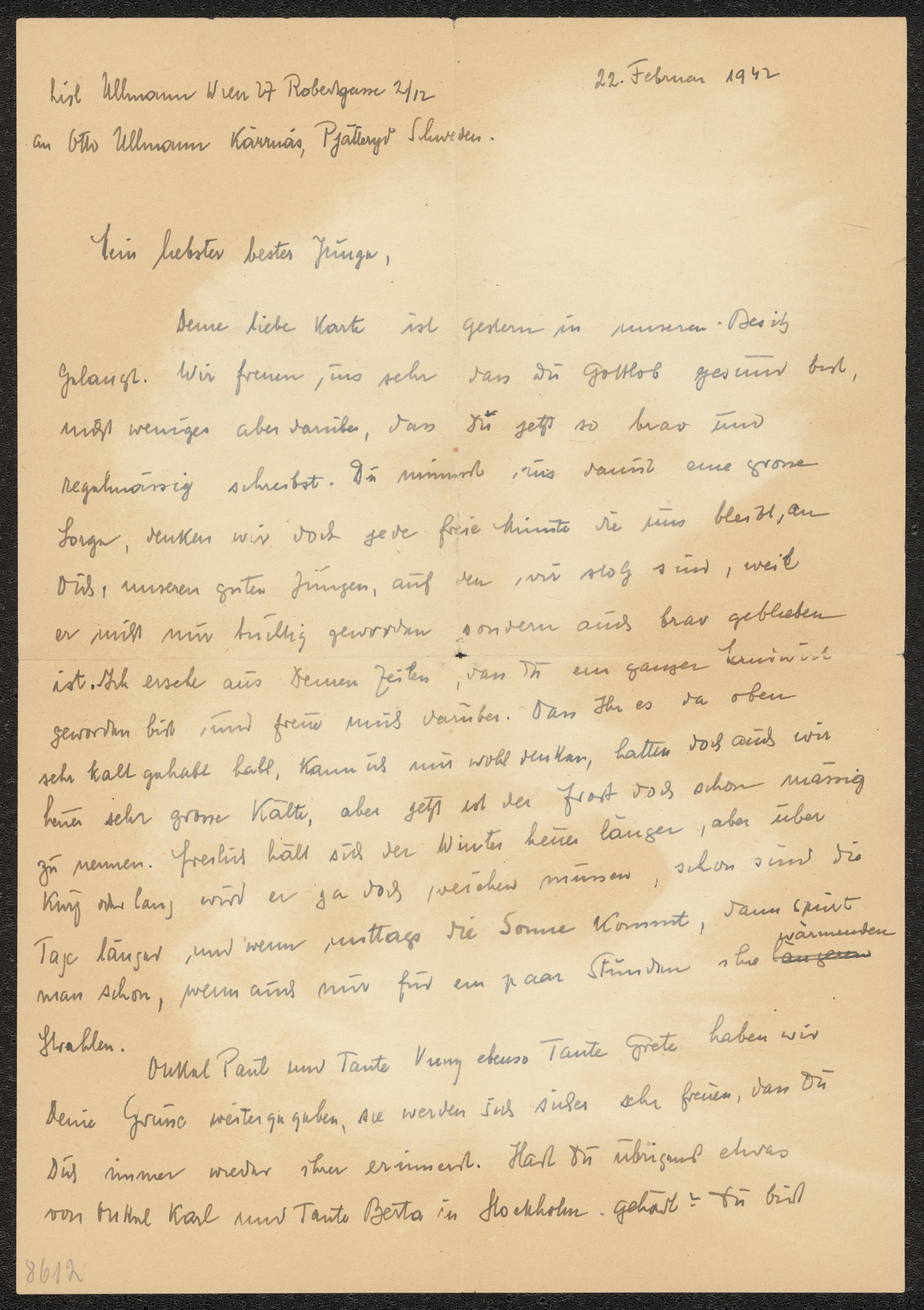 Brev till Otto Ullman från föräldrarna Josef och Elise Ullmann daterat 22 februari 1942 Wien.