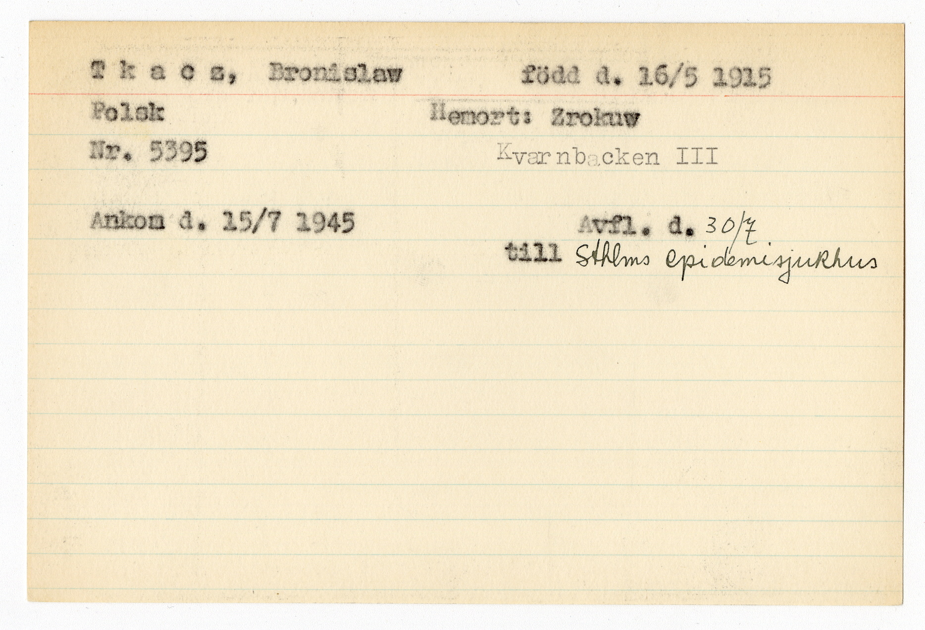 Ett skrivkort med patientuppgifter gällande Bronislaw Tkacz.