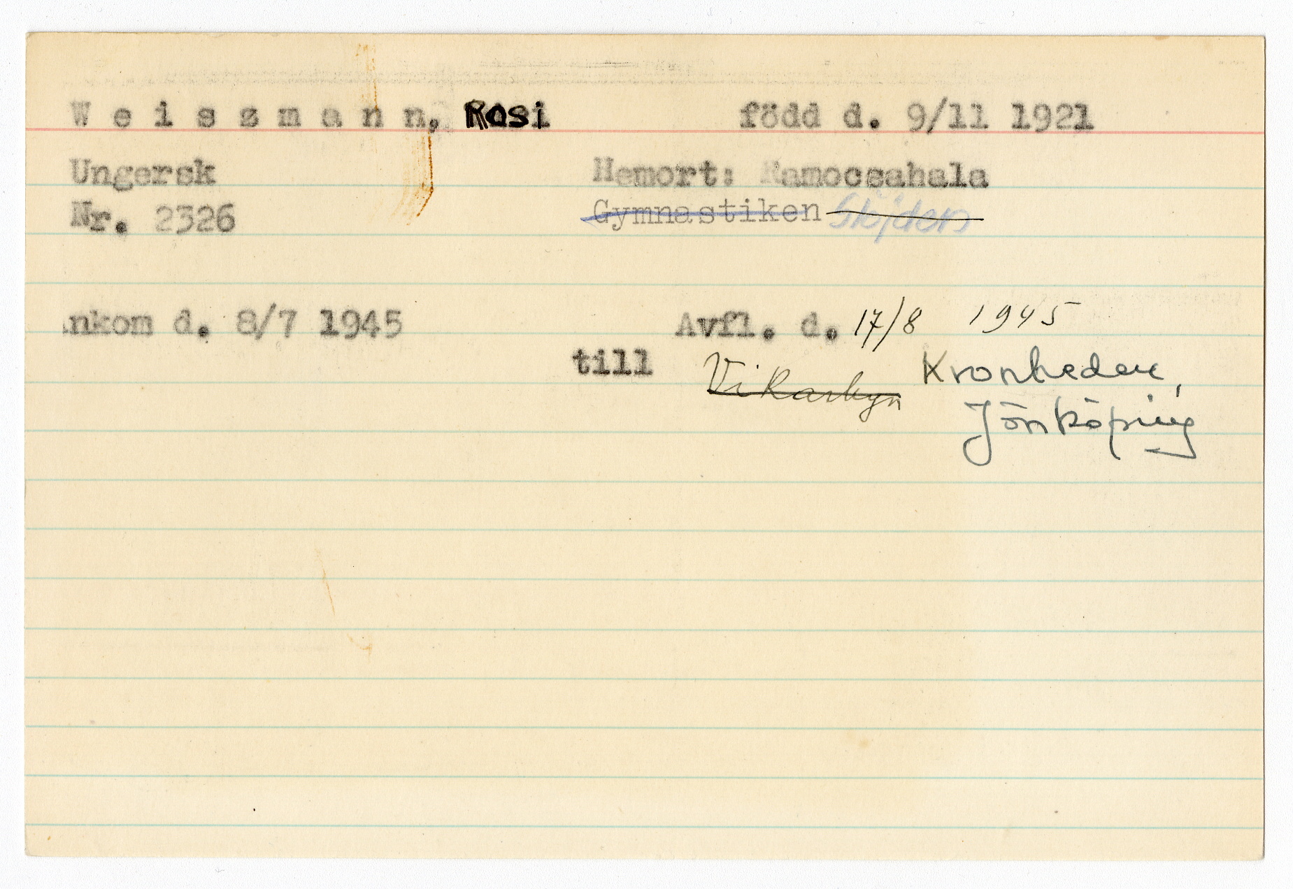 Ett skrivkort med patientuppgifter gällande Rosi Weiszmann.