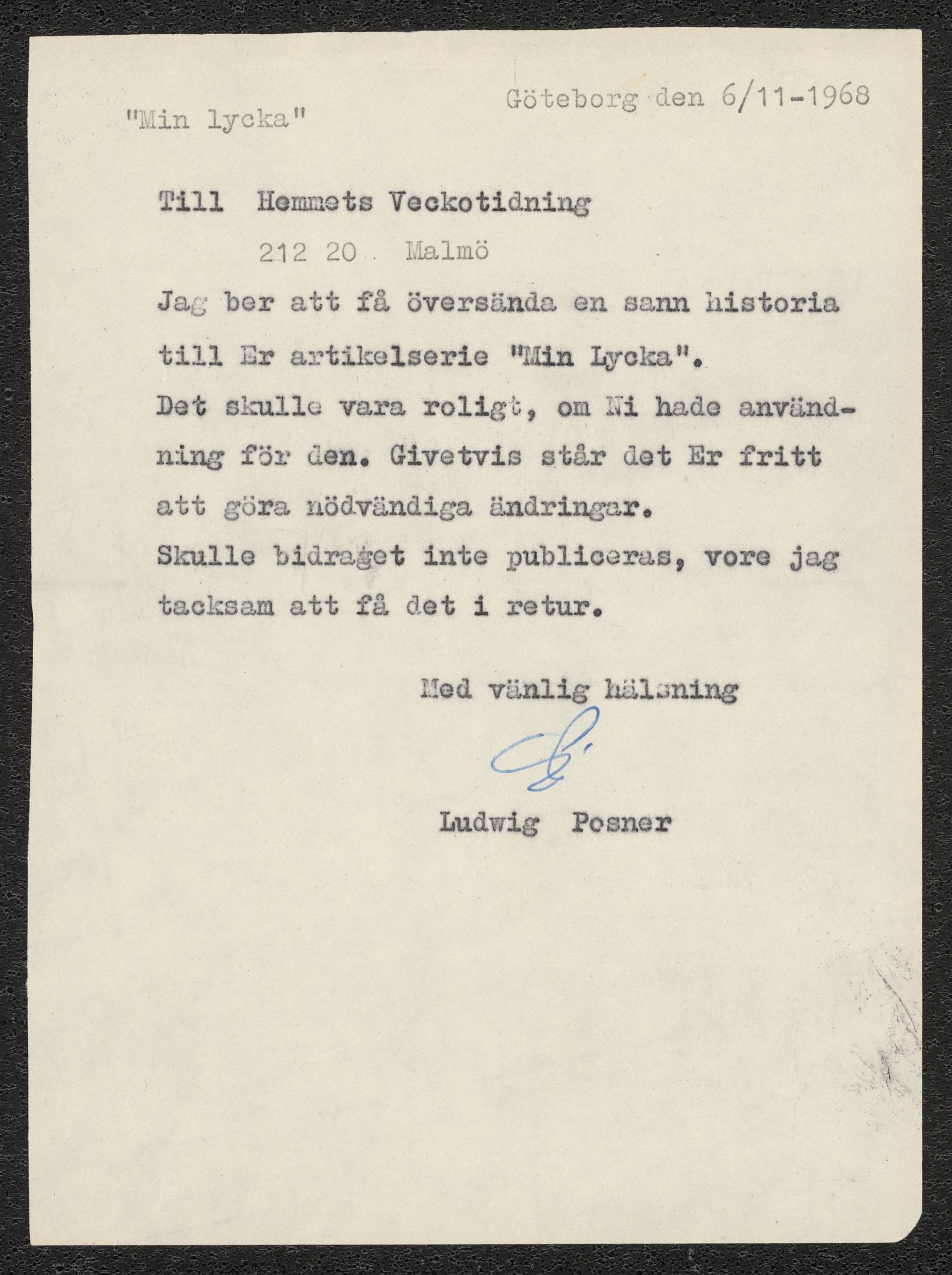 Brev till Hemmets Veckotidning från Ludwig Posner
