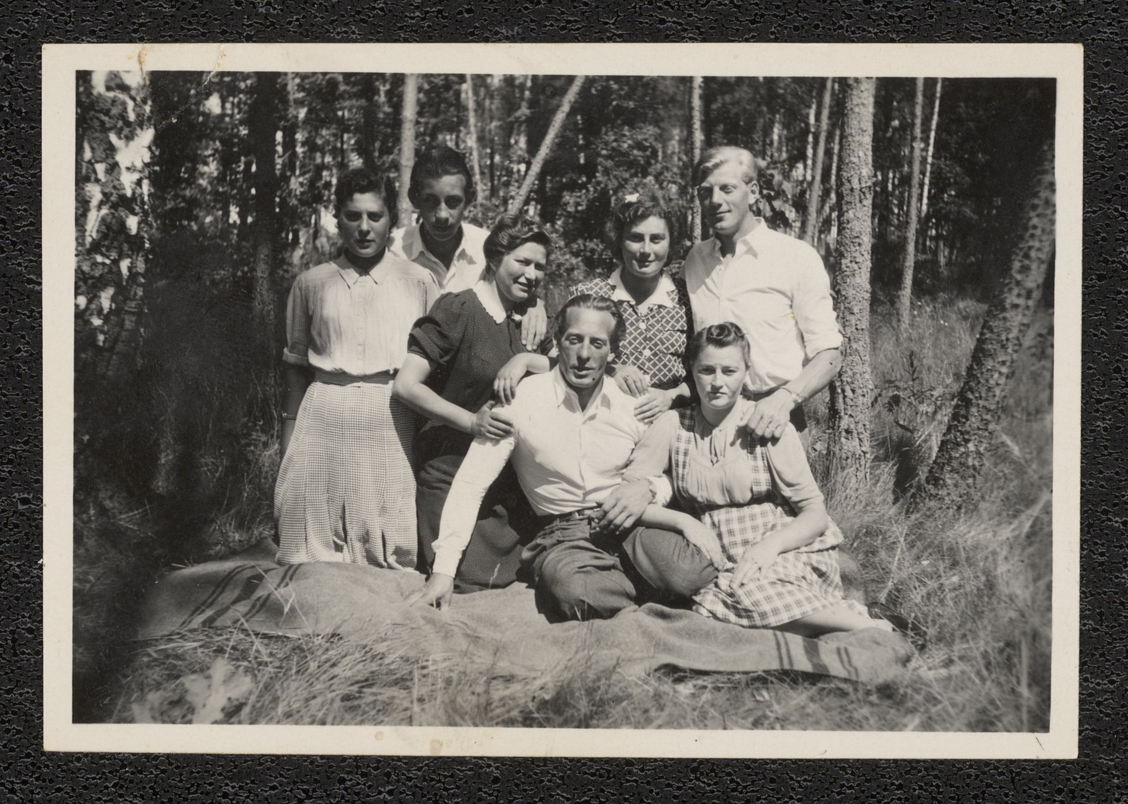 Gruppfoto från Visingsö sommaren 1945. Sju personer sitter på en filt i skogsmiljö. Tredje från vänster är Rosa Gustafsson. På baksidan finns texten: visingsö 12/7 45.