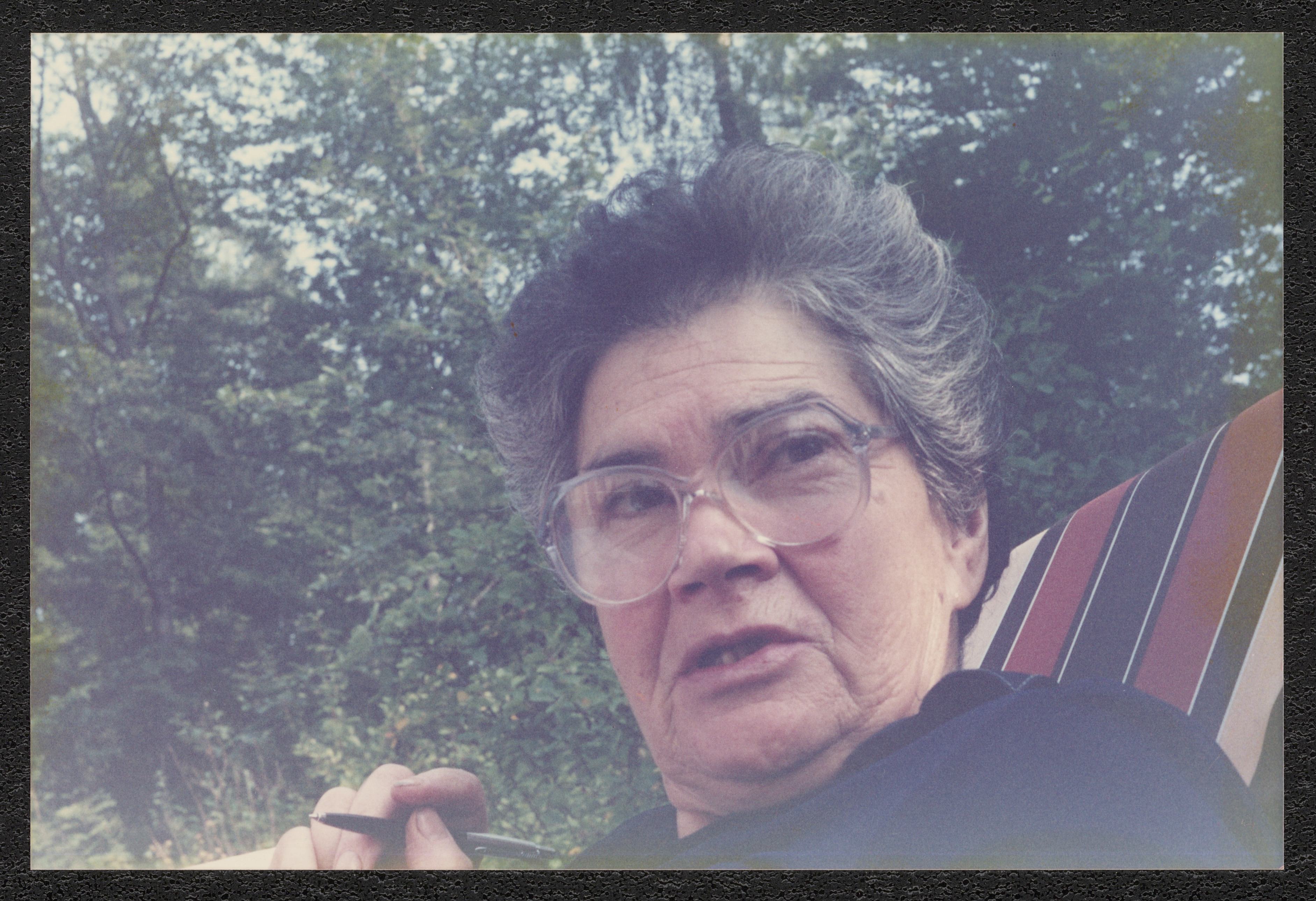 Ada Becker som äldre, med penna i handen. På baksidan finns anteckningar som ej relaterar till bilden.