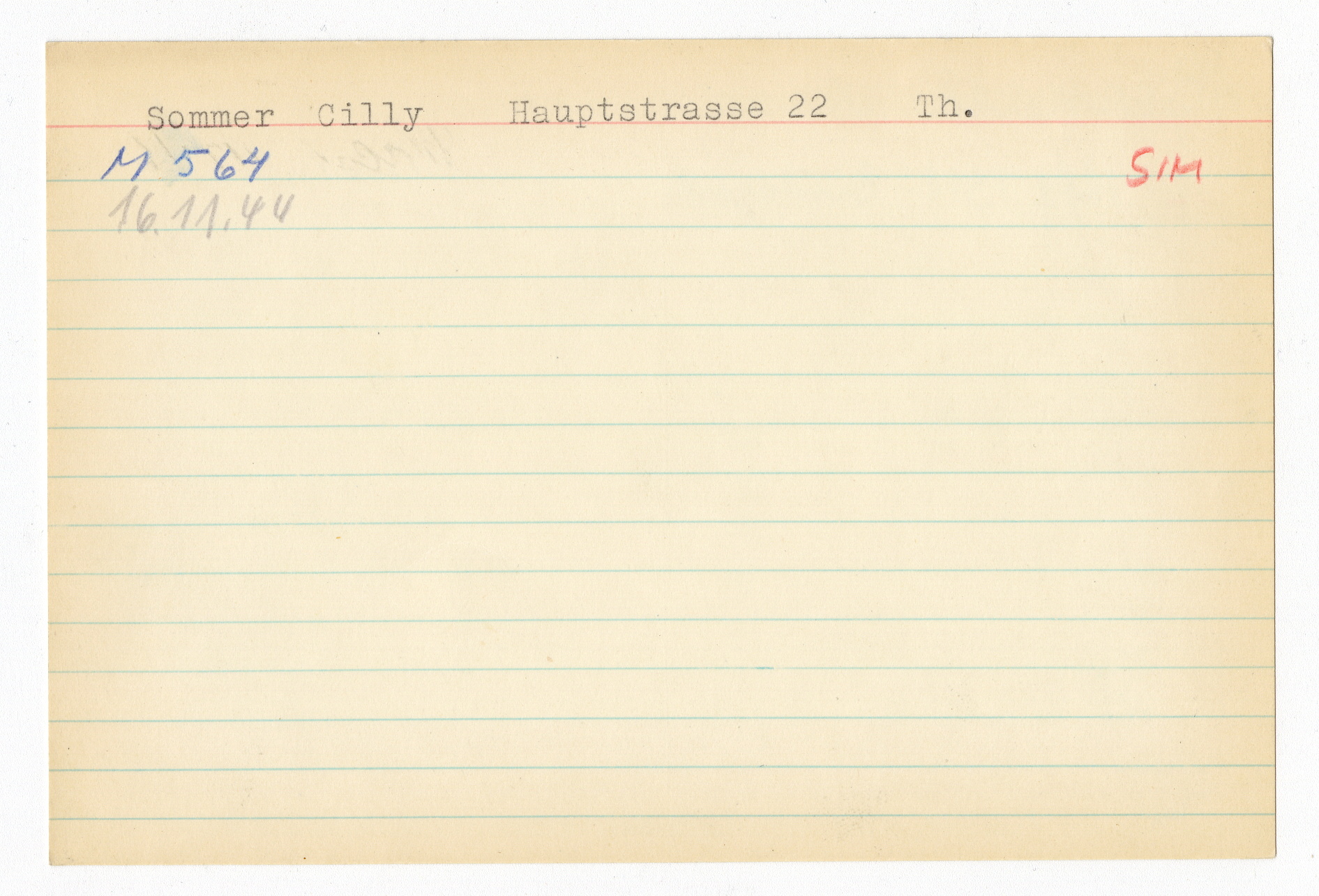 Ett skrivkort med patientuppgifter gällande Anna Bernath. På baksidan uppgifter om matpaket till Cilly Sommer i Theresienstadt.