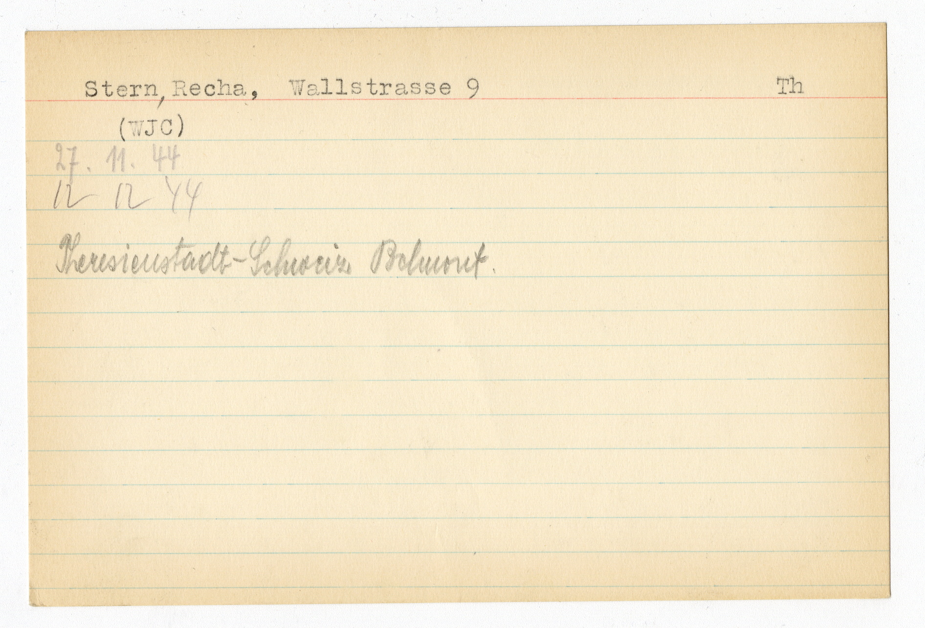 Ett skrivkort med patientuppgifter gällande Natalia Spielman. På baksidan uppgifter om matpaket till Recha Stern i Theresienstadt.