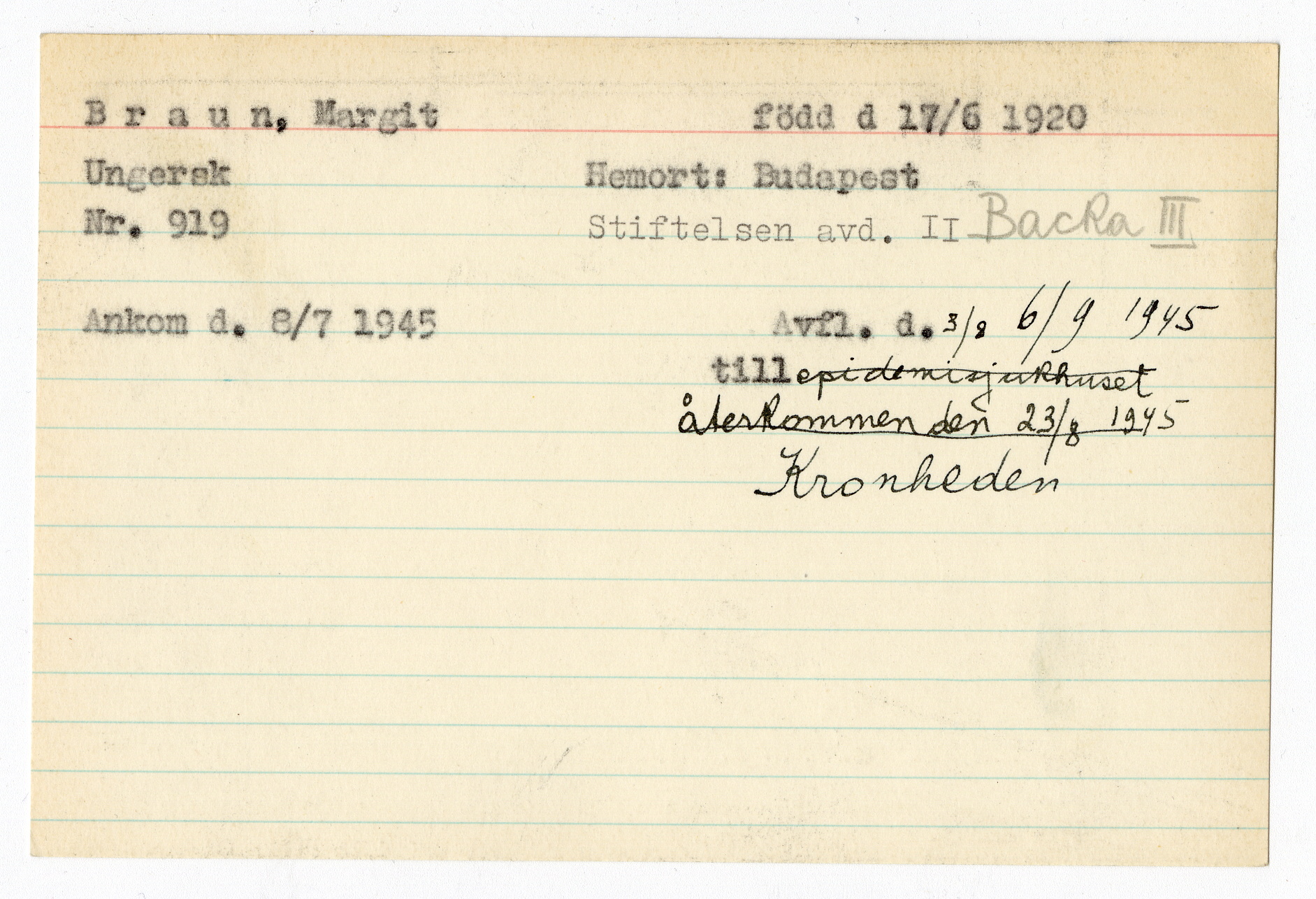 Ett skrivkort med patientuppgifter gällande Margit Braun.