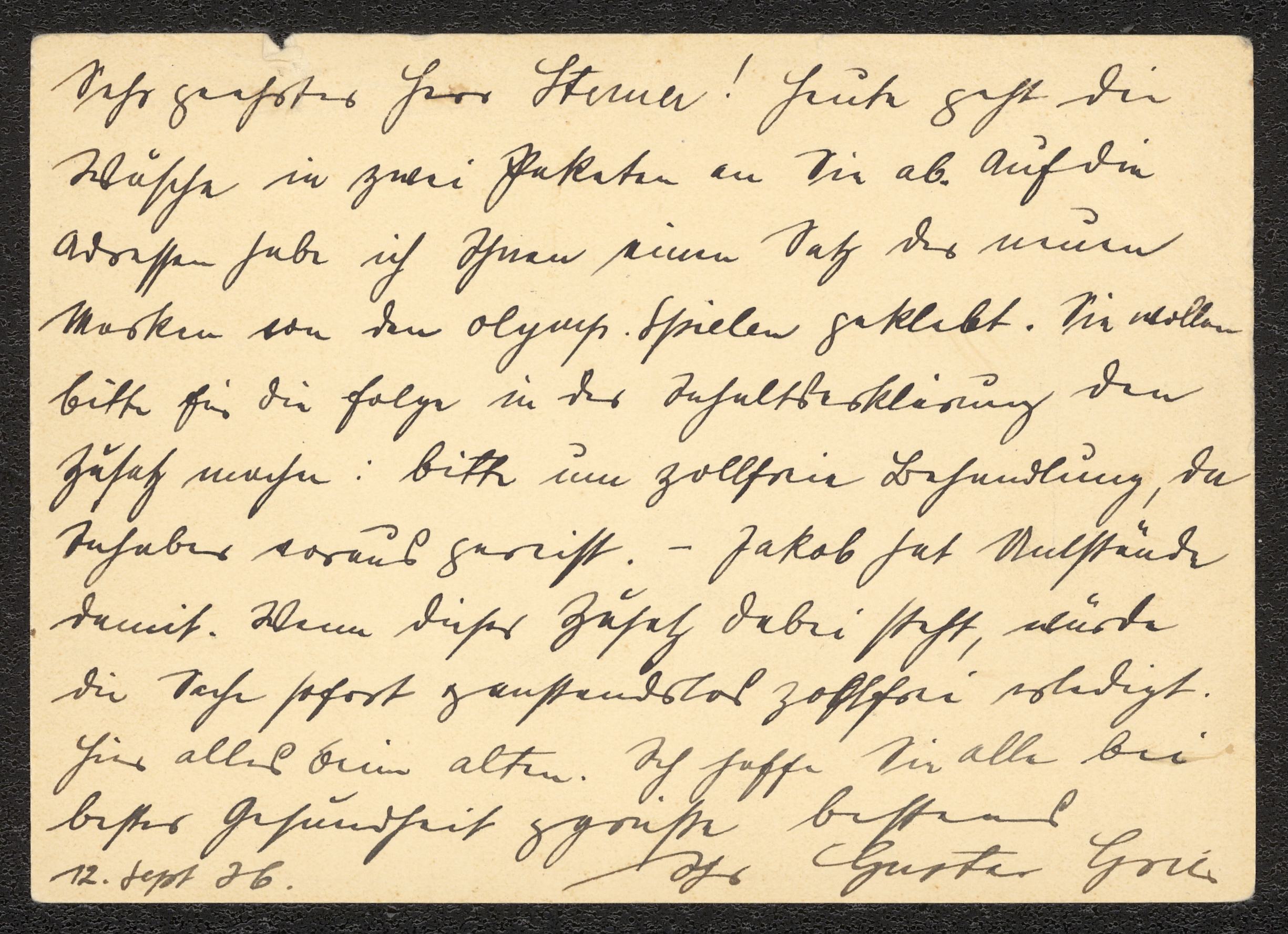 Brevkort till Rolf Sterner från "Gustav G.",. Eventuellt "Gustav Grosz".