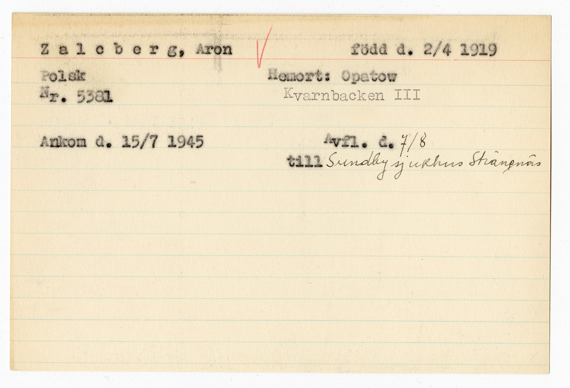 Ett skrivkort med patientuppgifter gällande Aron Zalcberg.