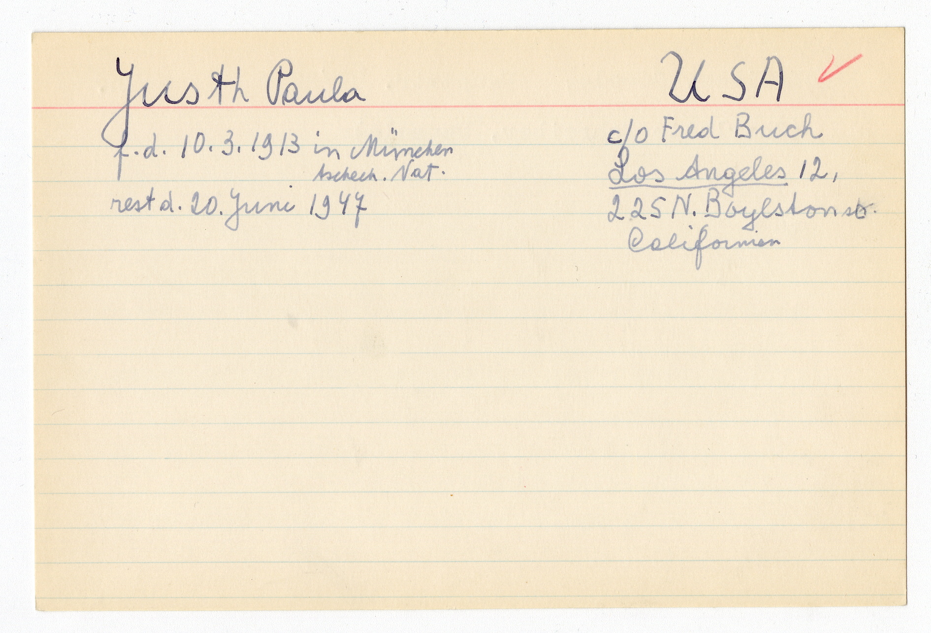 Ett skrivkort med patientuppgifter gällande Paula Justh. På baksidan uppgifter om matpaket till Gisela Schreiber i Theresienstadt.